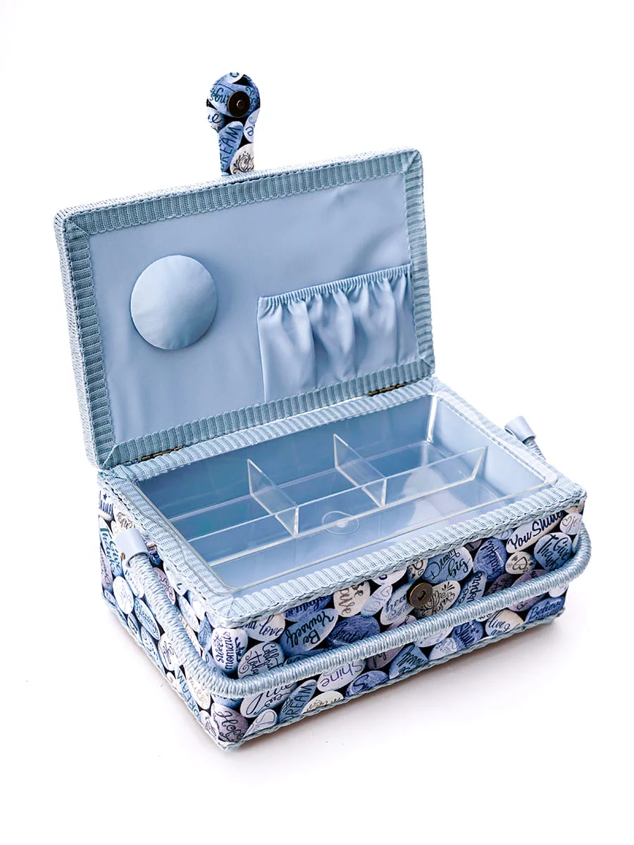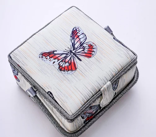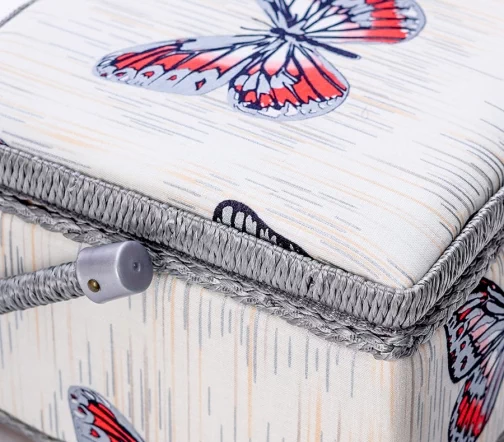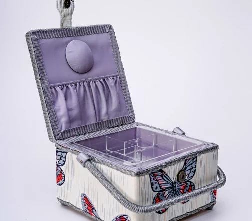 Шкатулка для рукоделия – незаменимый предмет для любой рукодельницы! В ней не только удобно хранить швейные принадлежности и аксессуары, такая шкатулка также станет прекрасным украшением интерьера! А еще это отличная идея для подарка тем, кто увлекается шитьем, вышиванием и другими видами рукоделия. Шкатулка обтянута тканью из 100% хлопка, имеет плетеную ручку для переноски и оплетку по периметру крышки. Внутри шкатулки на крышке закреплена подушечка для хранения игл, а также имеется внутренний контейнер из пластика с отделениями для хранения мелких аксессуаров.