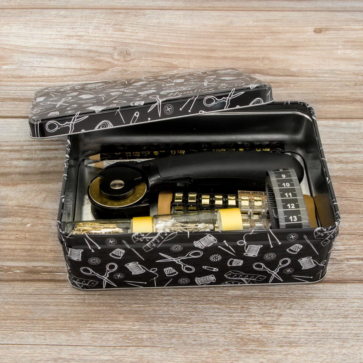 PT.TINS.L.HG Швейный набор в жестяной коробке, размер L 19х13х6,5см, цвет черный, Hemline