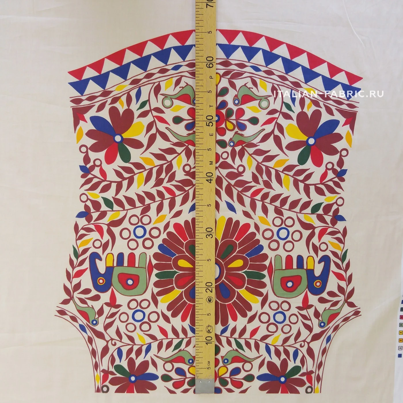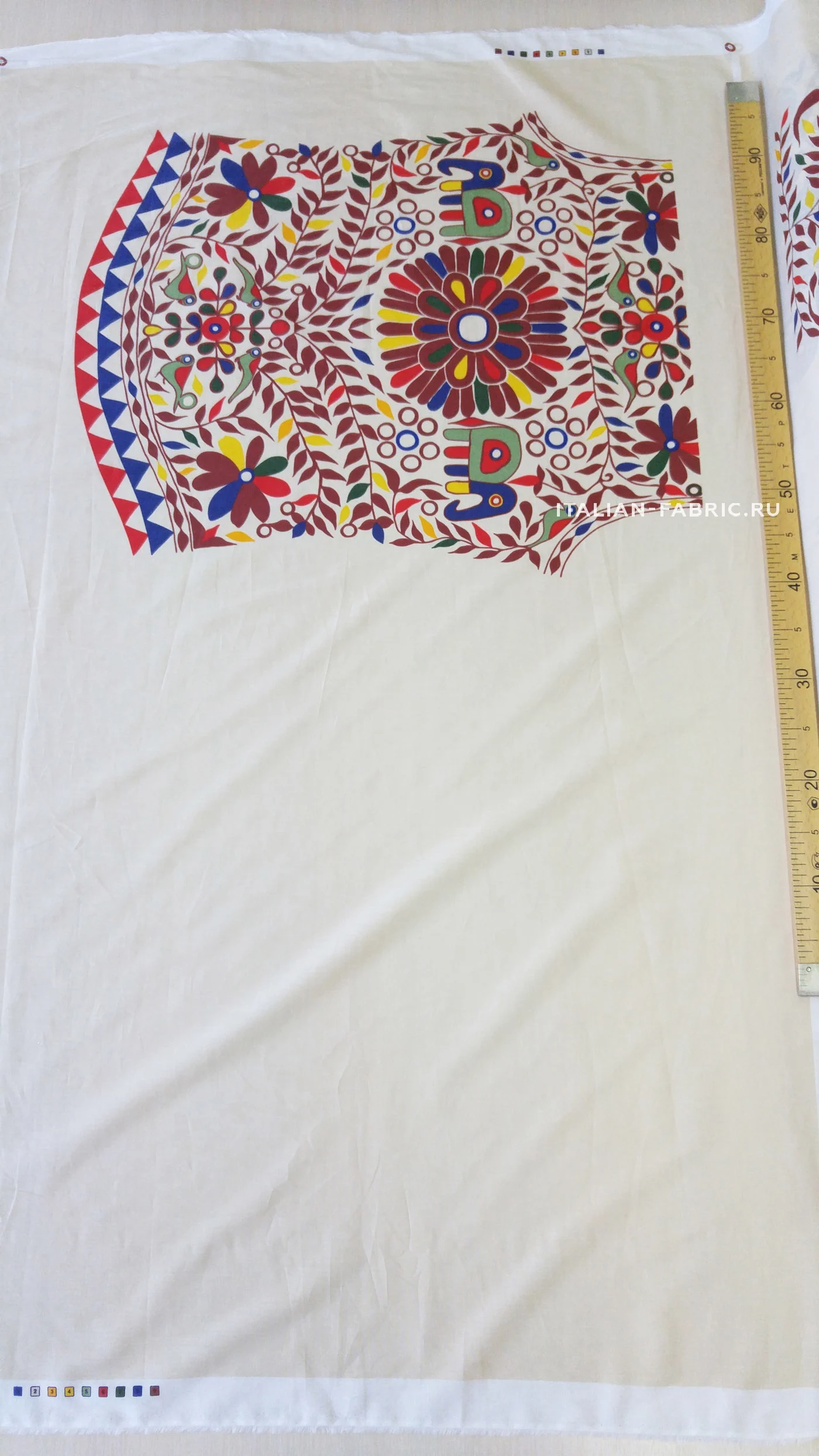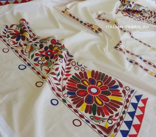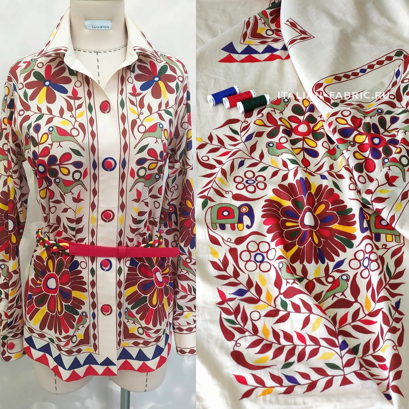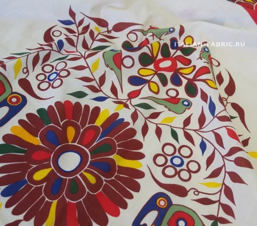 Очень оригинально и интересно смотрится летняя рубашка из хлопка Etro в, свойственном им, этническом стиле! Узор листьев, цветов, птиц и слонов яркий и плотный. В купоне готовая раскладка деталей на рубашку любого размера: спинка, кокетка, полочки, рукава, манжеты, воротник на стойке, карманы.