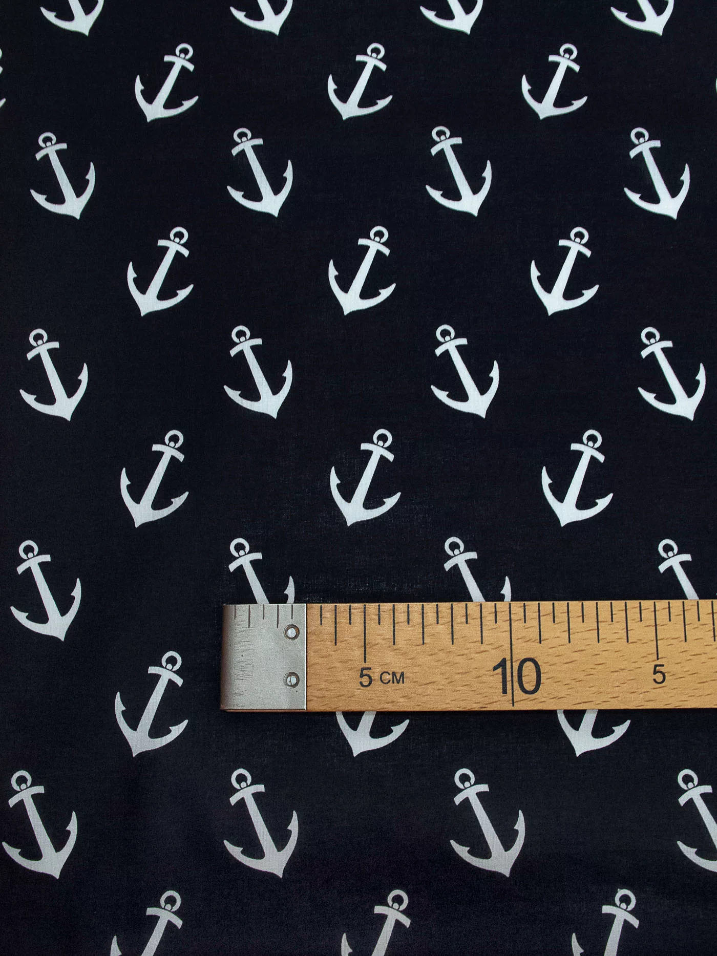 100% хлопок черно-синего цвета с принтом в виде белых якорей. Не сильно мнеться и слегка просвечивает.