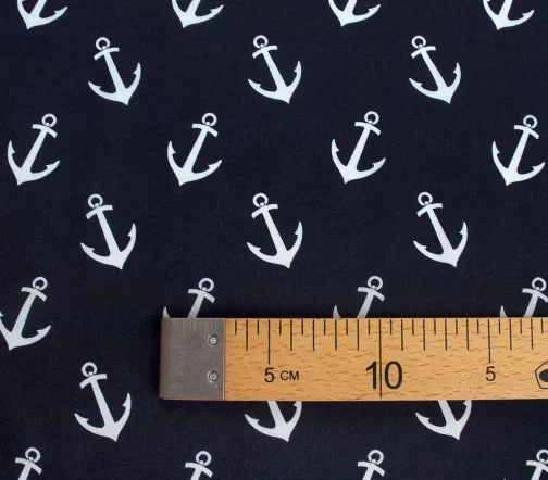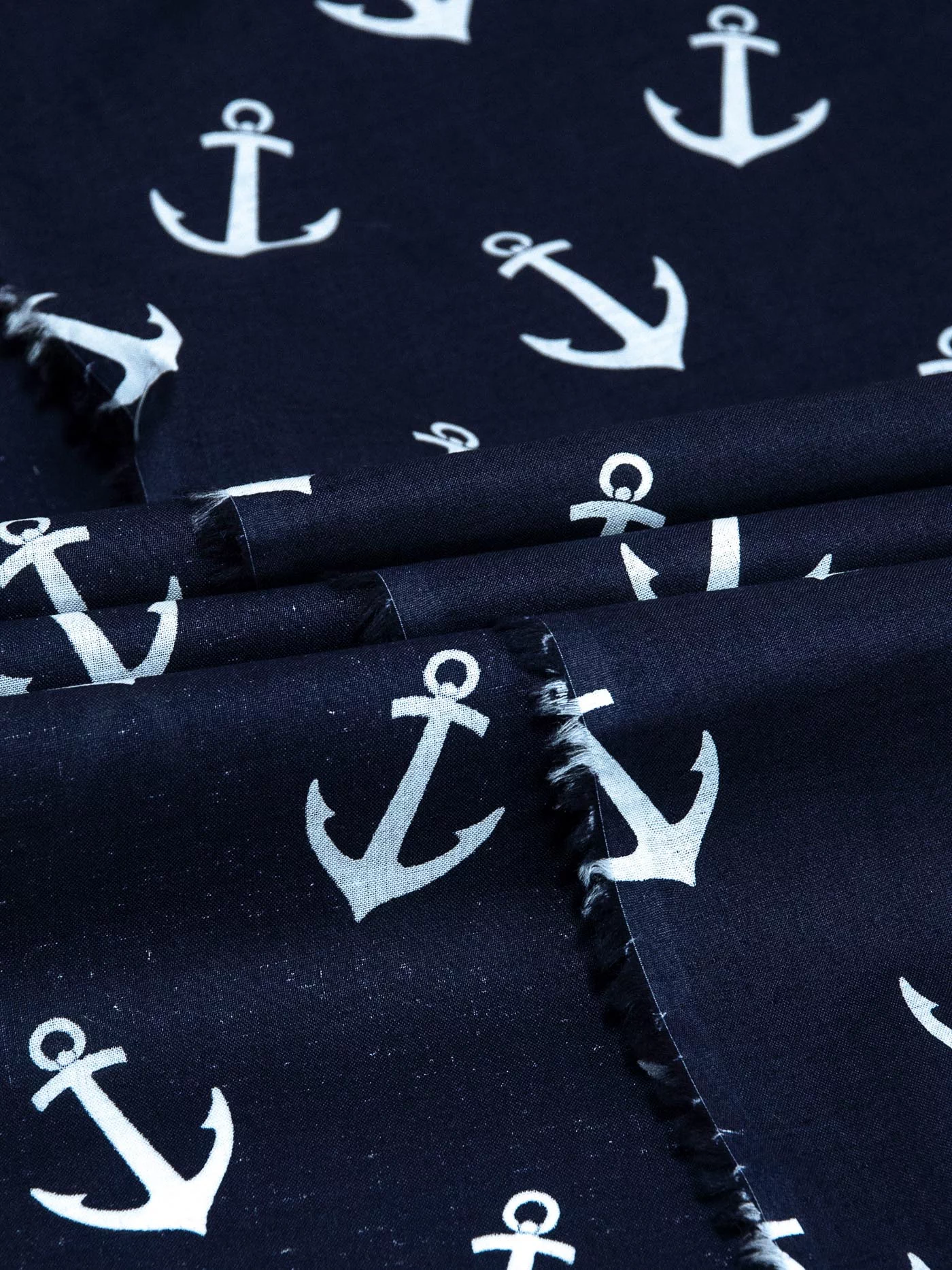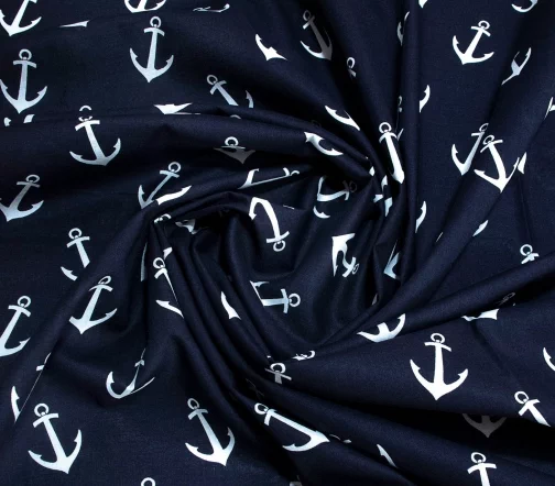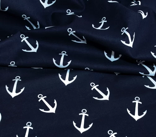 100% хлопок темно-синего цвета с принтом в виде белых якорей. Не сильно мнеться и слегка просвечивает.