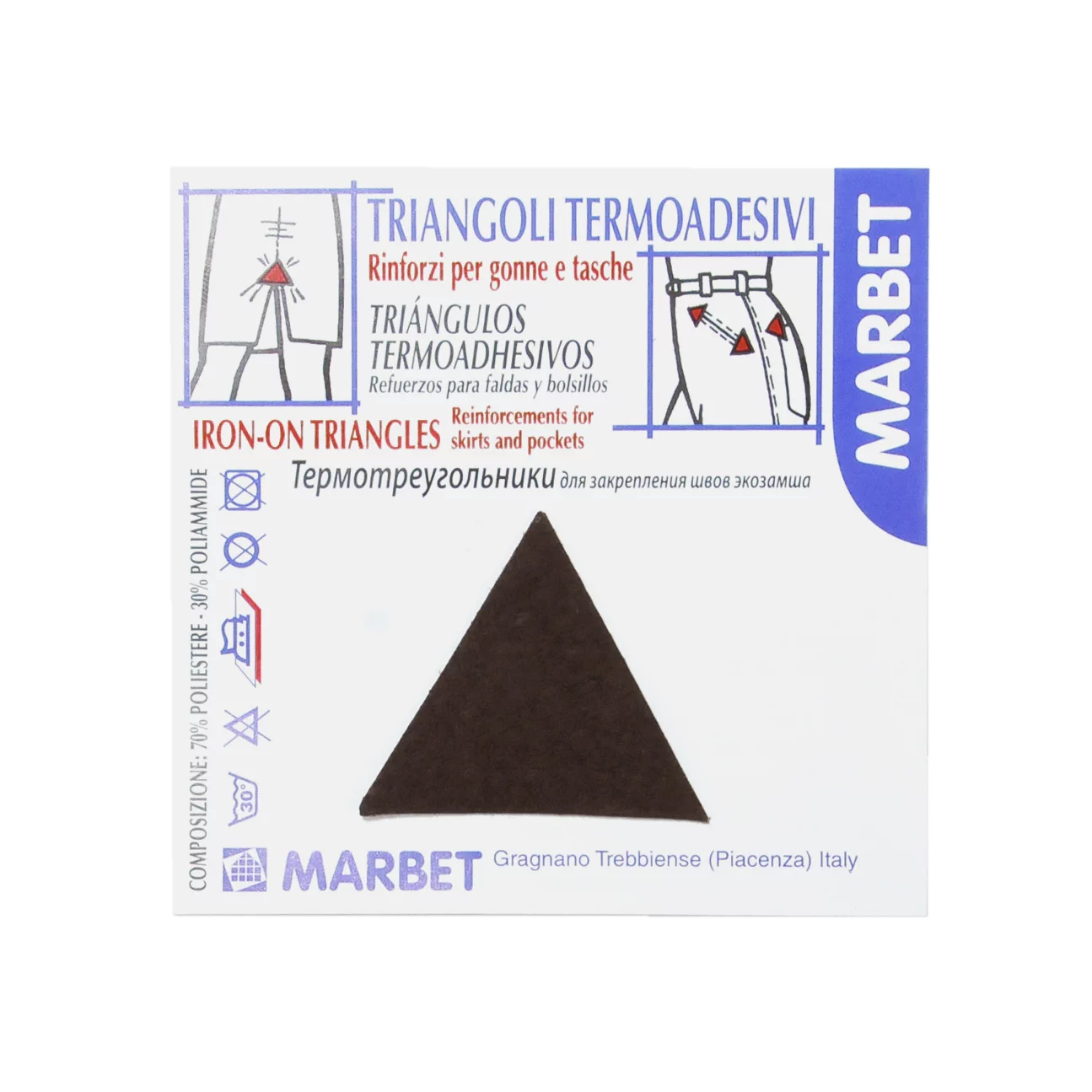 Размер треугольника 35 мм. Состав: 70% полиэстер, 30% полиуретан. В упаковке 4 шт. Термотреугольники приклеивают при помощи утюга всего за 30 секунд. Используются для укрепления швов на карманах и юбках.