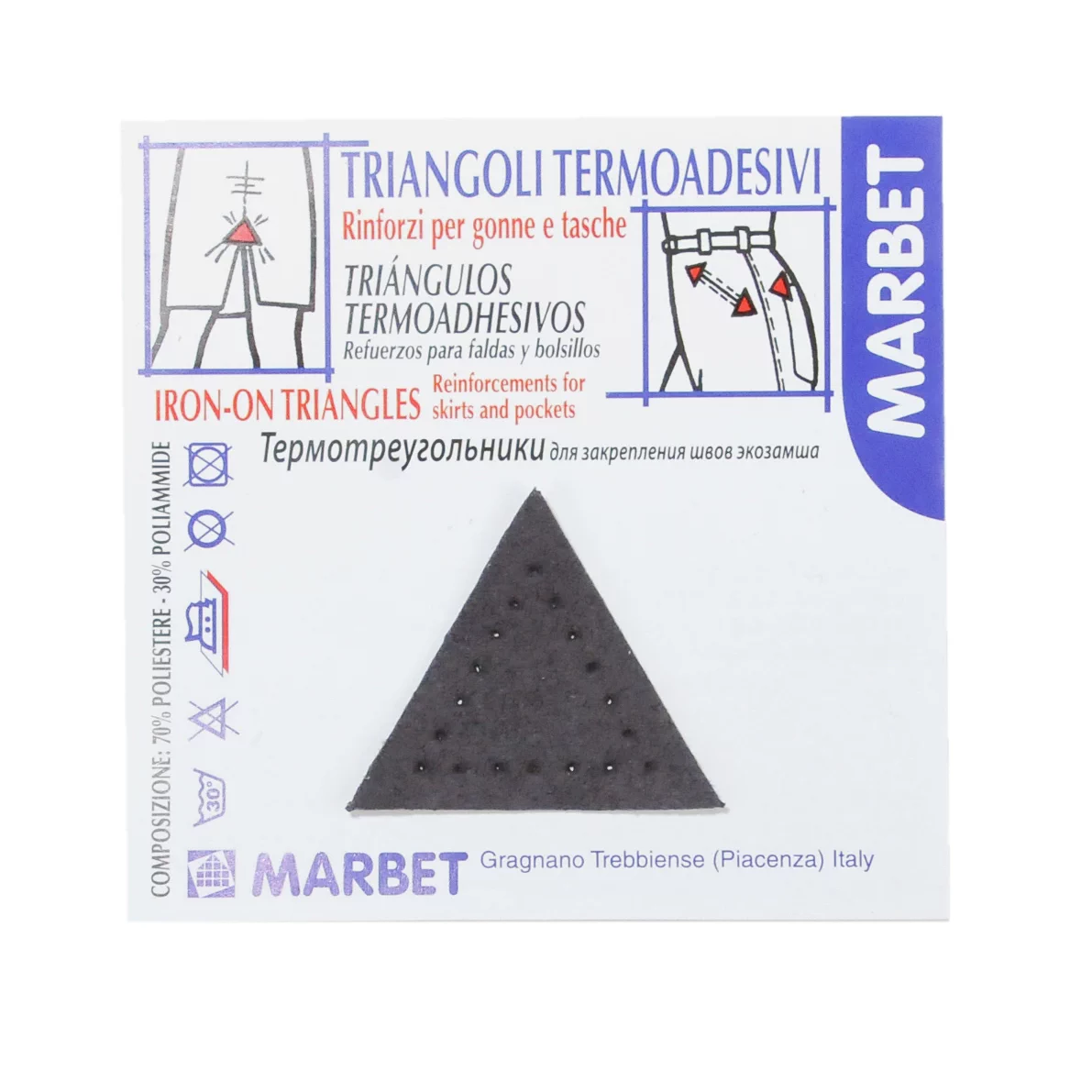 Размер треугольника 35 мм. Состав: 70% полиэстер, 30% полиуретан. В упаковке 4 шт. Термотреугольники приклеивают при помощи утюга всего за 30 секунд. Используются для укрепления швов на карманах и юбках.