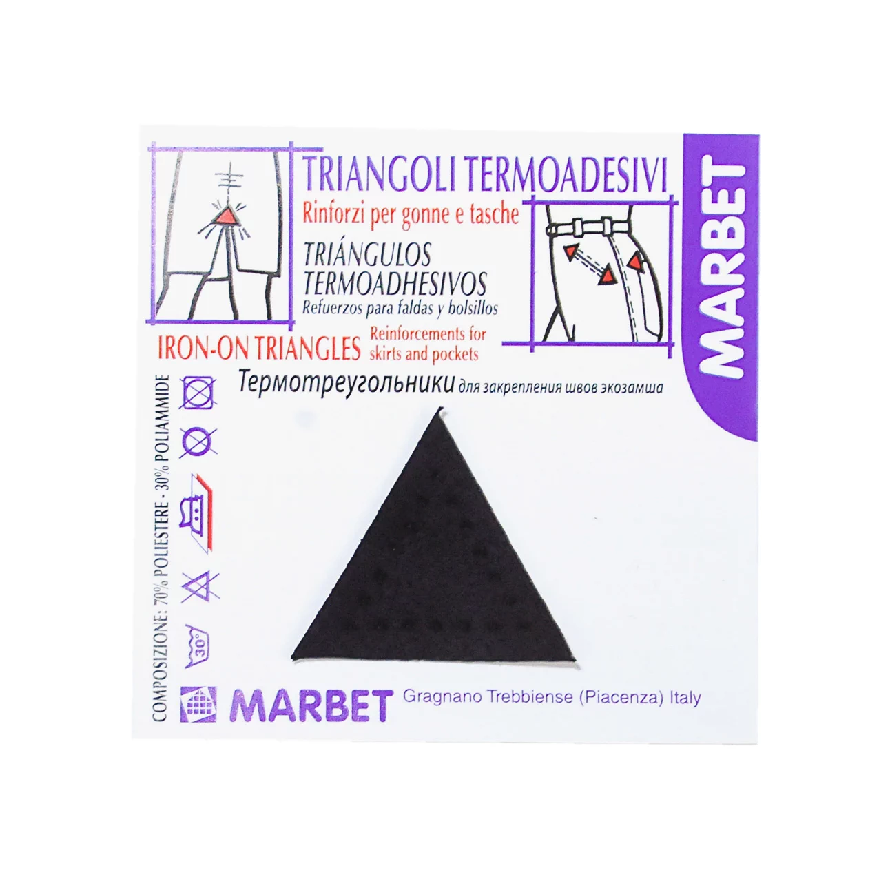 Размер треугольника 35 мм. Состав: 70% полиэстер, 30% полиуретан. В упаковке 4 шт. Термотреугольники приклеивают при помощи утюга всего за 30 секунд. Используются для укрепления швов на карманах и юбках.