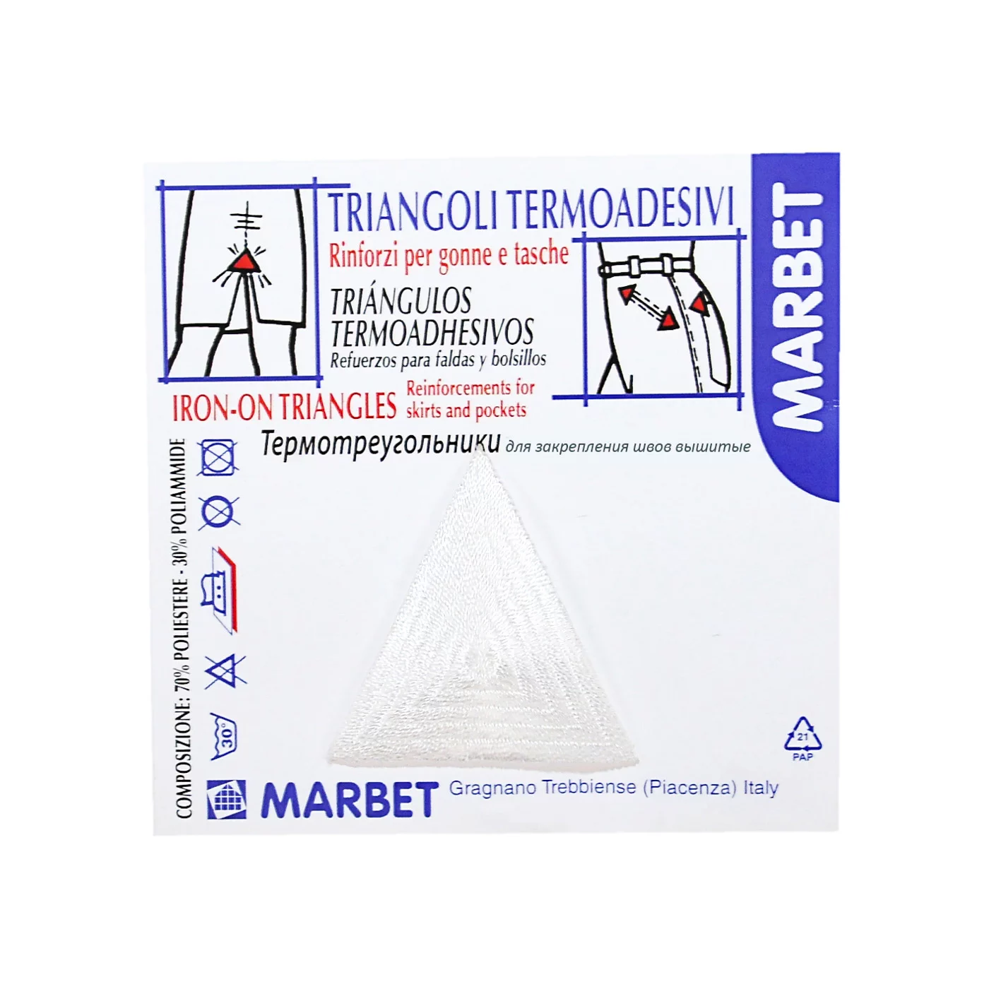 Размер: 35 мм. Состав: 70% полиэстер, 30% полиамид. В упаковке 4 шт. Термотреугольники приклеивают при помощи утюга всего за 30 секунд. Используются для укрепления швов на карманах и юбках.
