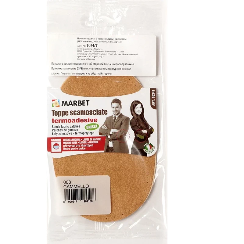 Размер 16 х 10,5 см. Состав: 52% акрил 30% хлопок 18% вискоза. В блистере 2 шт. Заплатки повторяют элегантную структуру настоящей замши. Цвета не подвержены изменениям. Рекомендованы для ремонта верхней и трикотажной одежды (пиджаков, кардиганов, пальто, курток) в области локтей. Дополнительно заплатку можно пришить (контрастным цветом нити или в тон), используя подготовленные отверстия по краям.