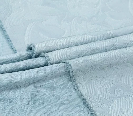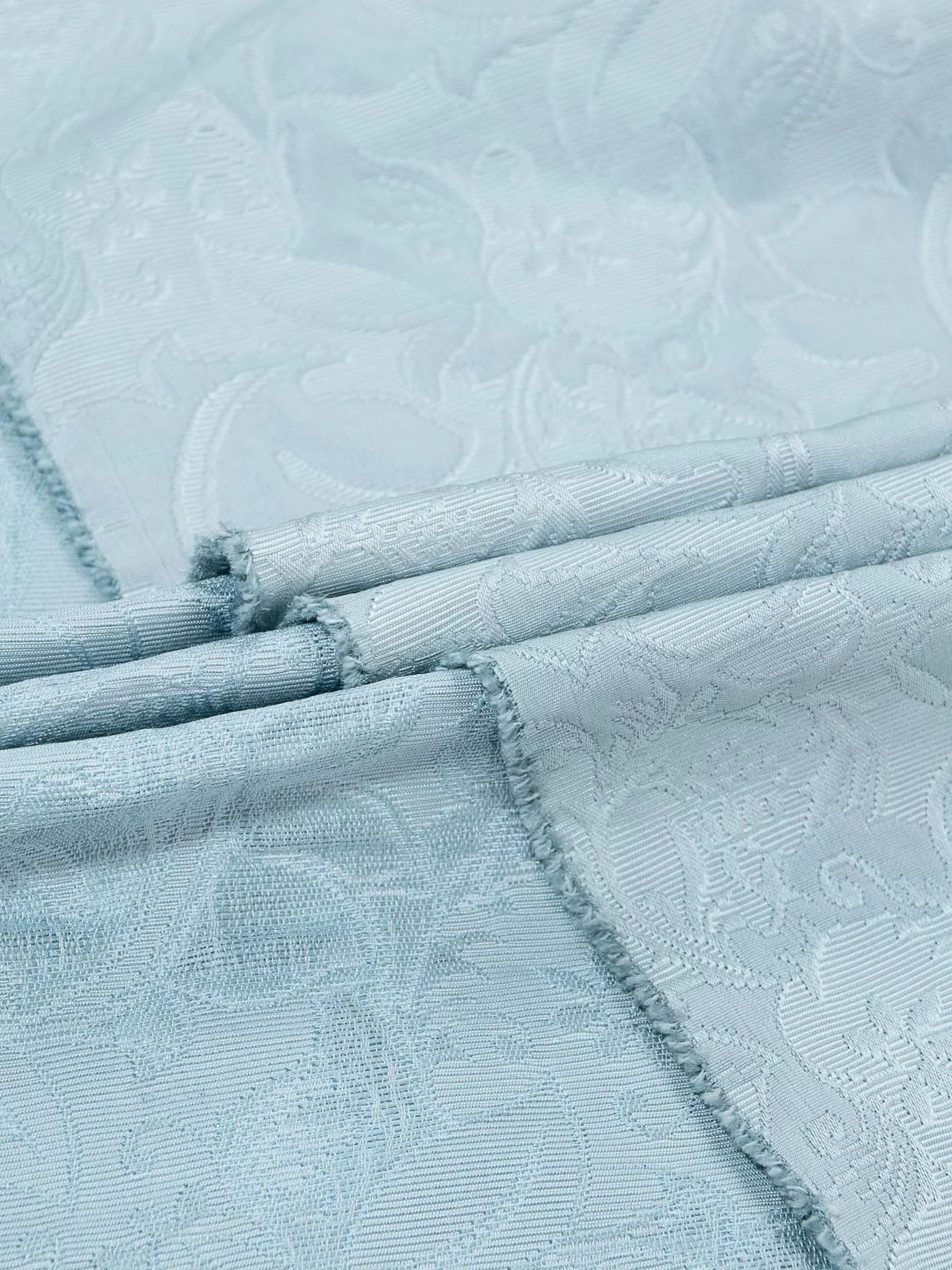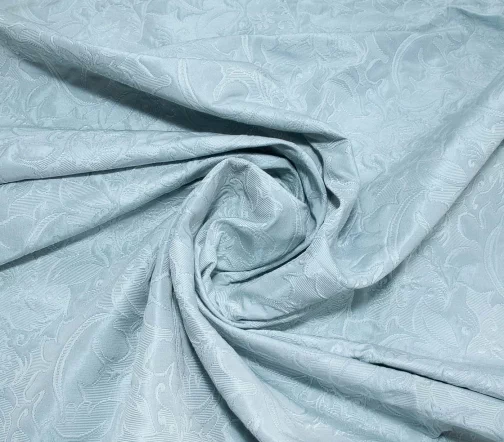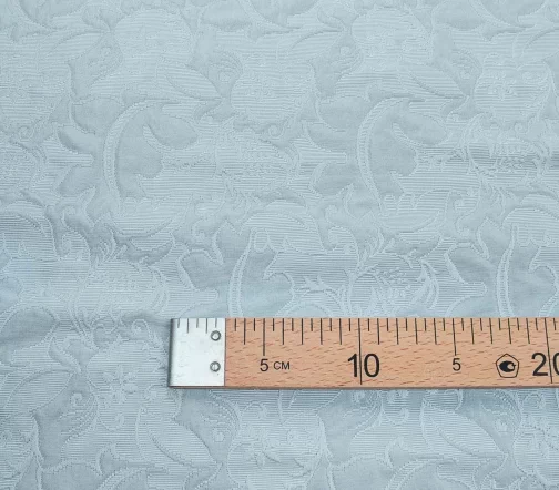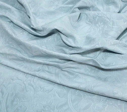 Очень красивый, средней плотности, серо-голубой с жемчужной ноткой жаккард (оттенок холодный), держит форму. Прекрасно из такого жаккарда будут смотреться стильные костюмы и летние пальто.
