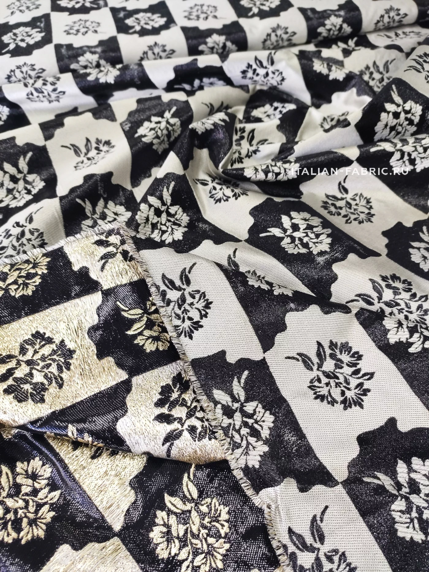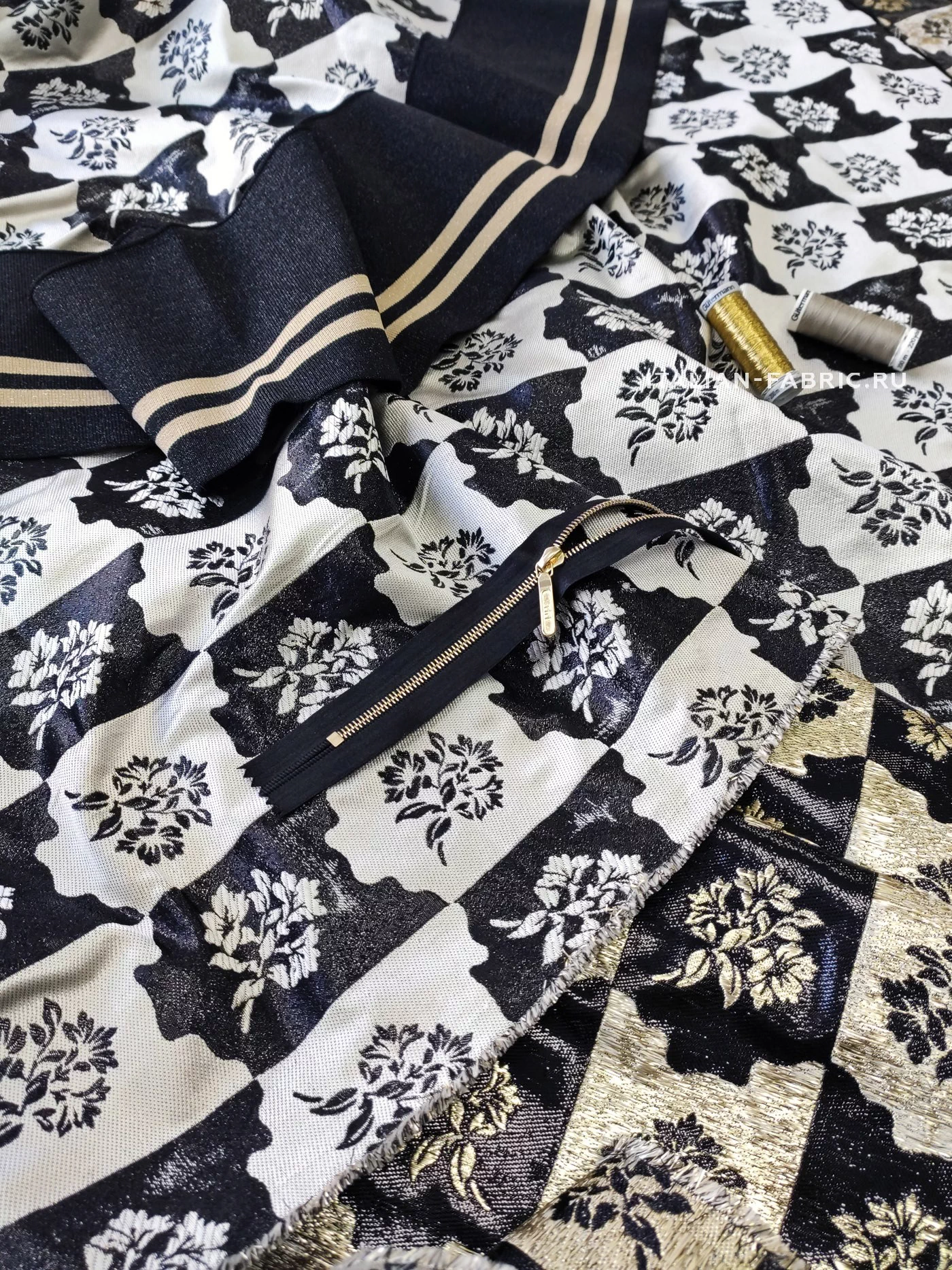 Черно-бежевая основа и голубой люрекс. Декоративная клетка - 6см х 7см. Для пошива шикарных жакетов и юбочек (костюмная группа).