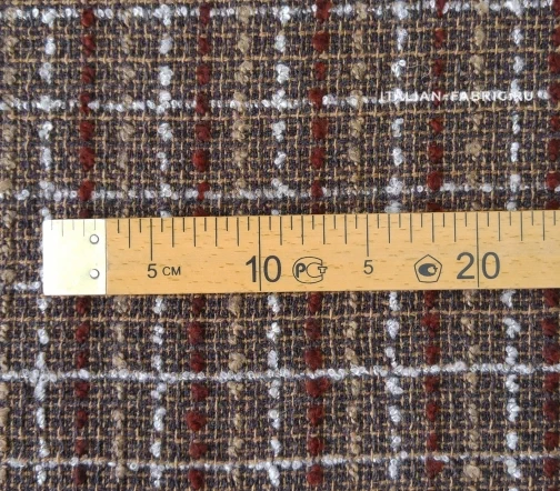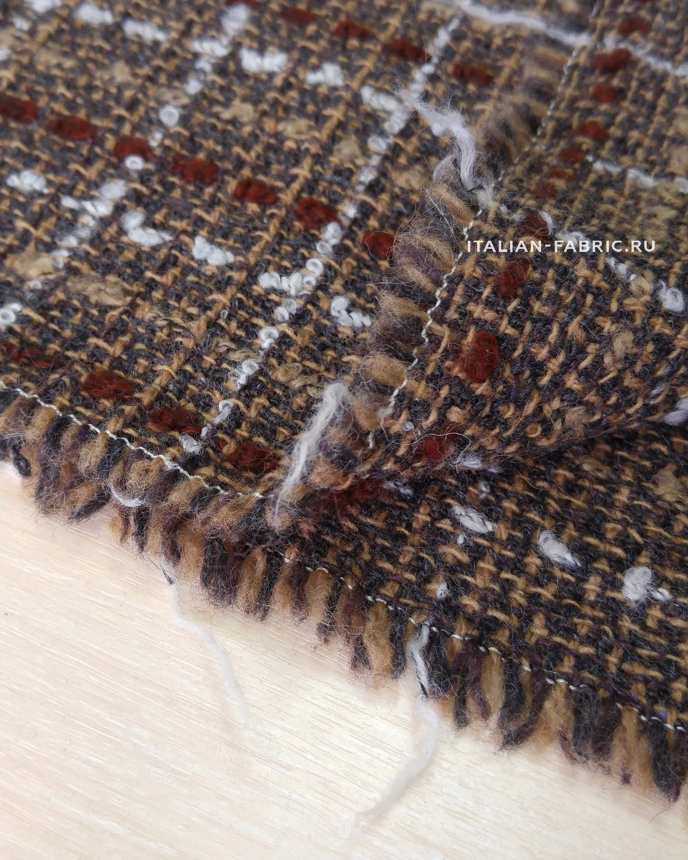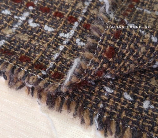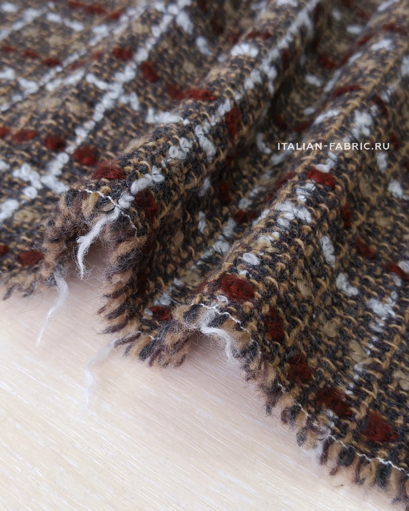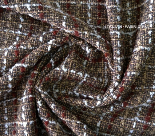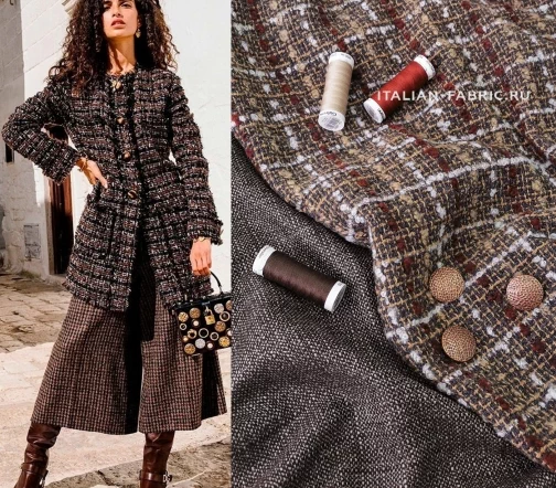 Костюмная ткань на основе шерсти с белыми, графитовыми, бежевыми, тициановыми нитями смотрится очень эффектно в удлиненных жакетах, легких пальто и костюмных ансамблях. Сочетание нескольких оттенков нитей материала делает его универсальным в комплектации по цветовой гамме, а шикарная фактура с объемными нитями создает привлекательный контраст фактур при сочетании с другими материалами. Материал приятный тактильно, пластичный, средней плотности, можно кроить по долевой и поперечной нити.