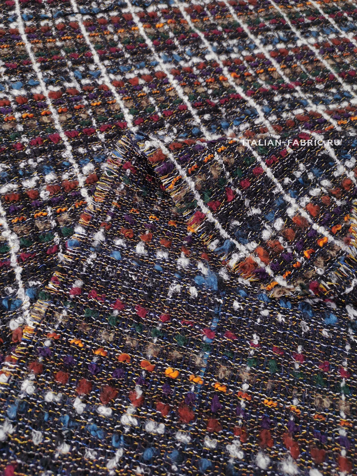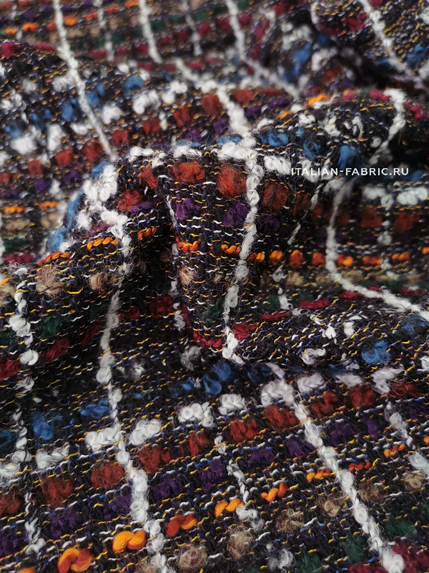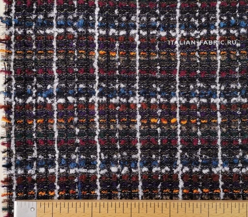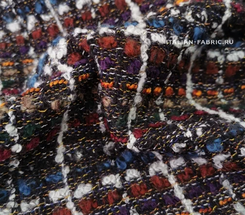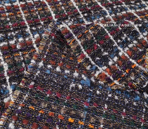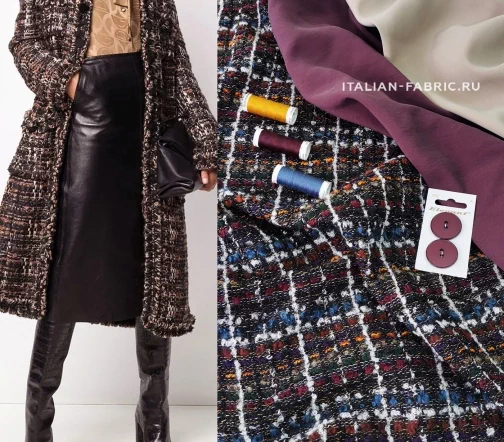 Сочетание множества разноцветных нитей материала делает его универсальным в комплектации по цветовой гамме, а шикарная фактура с буклированными нитями создает привлекательный контраст фактур при сочетании с экокожей, денимом, шелком, купрой. Костюмная ткань на основе шерсти с акцентными белыми, бордовыми, рыжими, синими, зелеными нитями смотрится очень эффектно в удлиненных жакетах, легких пальто и костюмных ансамблях. Материал мягкий, приятный тактильно, средней плотности, можно кроить по долевой и поперечной нити.