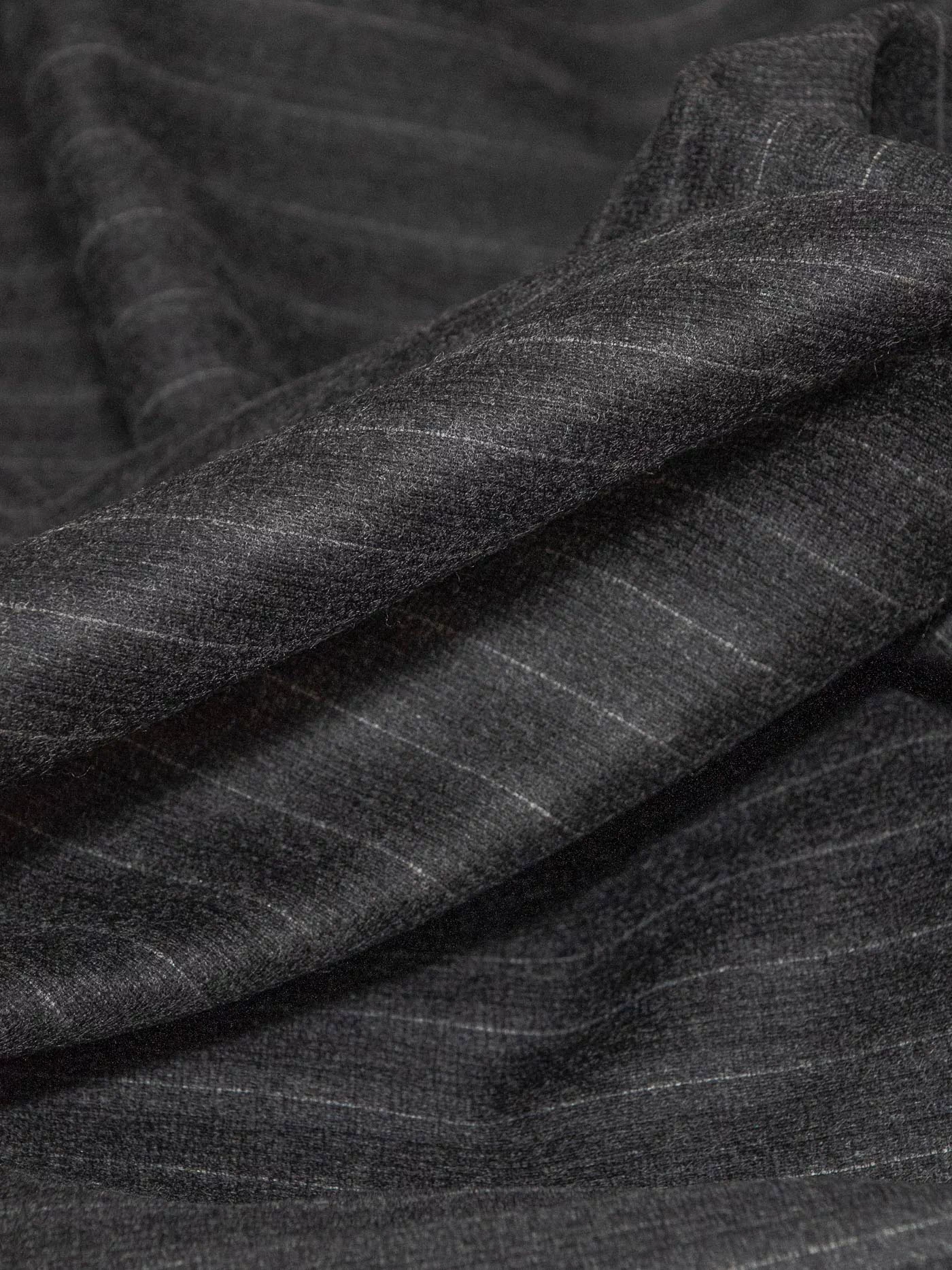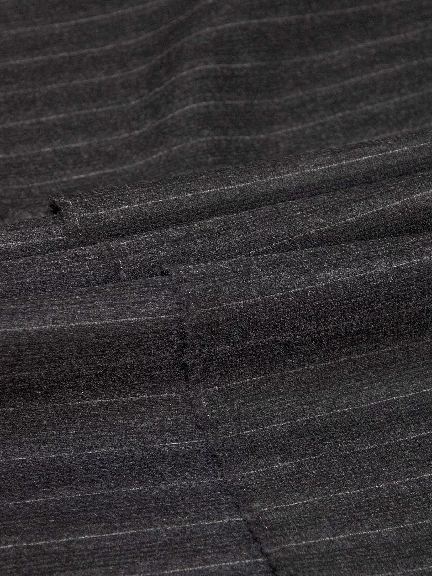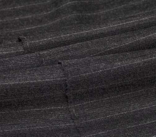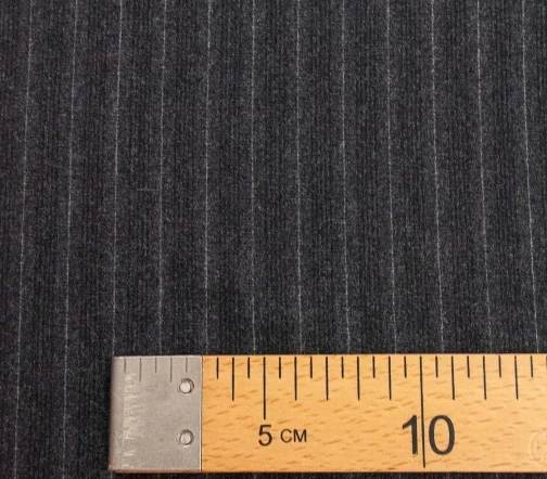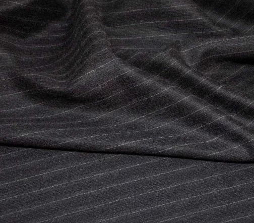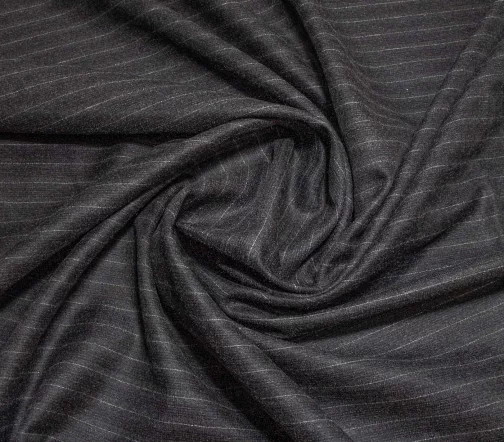Средней плотности, ближе к тонкой, шелковистая, не колючая, изумительного качества костюмка, цвет графитовый, цвет полосок переходит от темно-серого до ярко-выраженного молочного.
