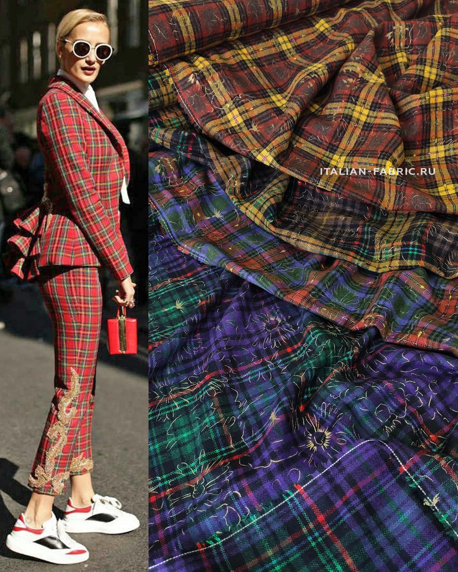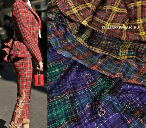 Клетку обожают абсолютно все модницы, ведь она может быть такой разной и оригинальной. Для ценителей клетчатого узора рекомендуем наши новинки – эффектные костюмные ткани с накатом – цветочным узором золотым люрексом поверх тартана разных оттенков. Сочетание строго делового узора клетки и яркого игривого золотого рисунка придает материалу особую пикантность и очарование