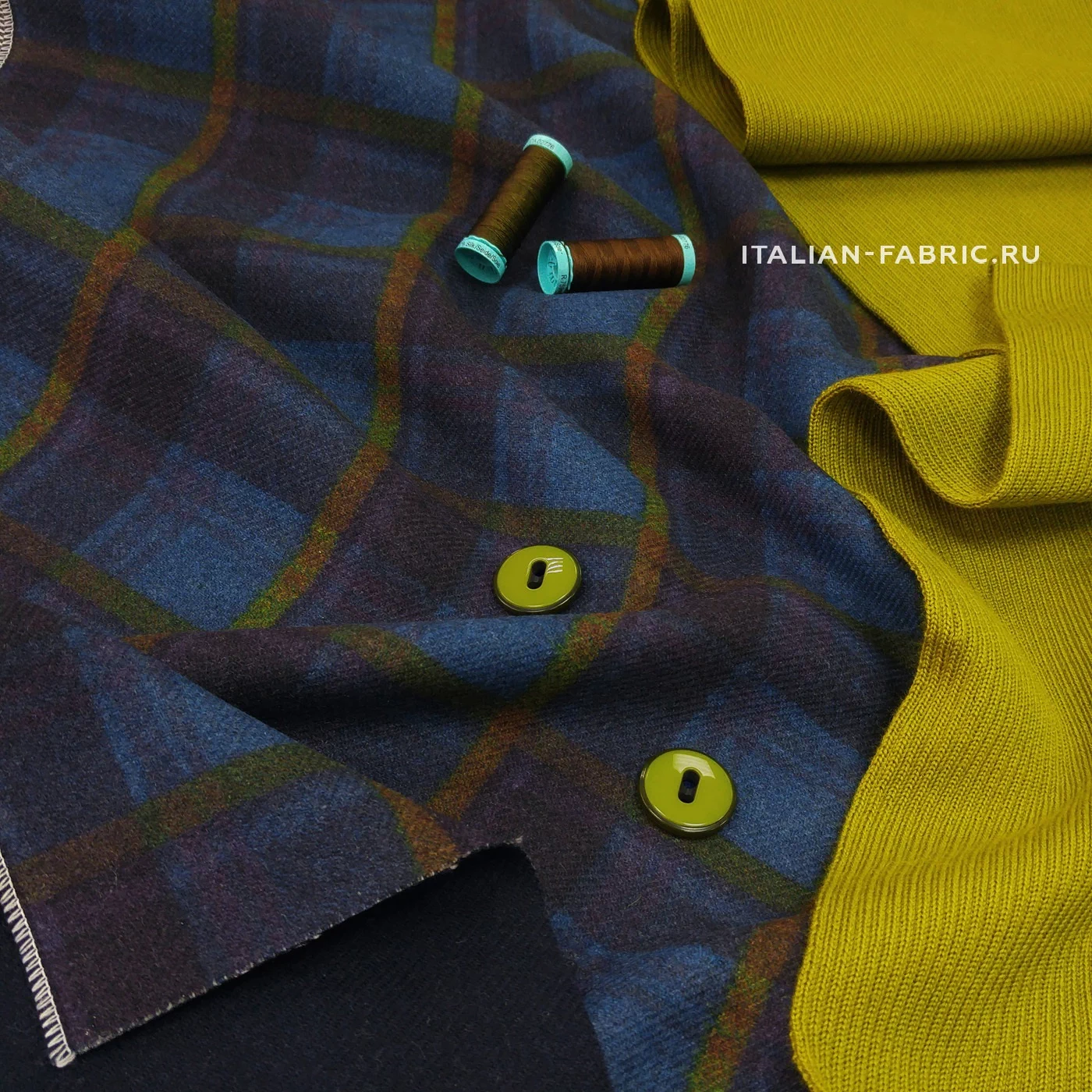 Материал самого высокого качества, очень мягкий и приятный тактильно, легкий, но теплый. Клетка в оригинальном сочетании синих и желто-зеленых цветов.