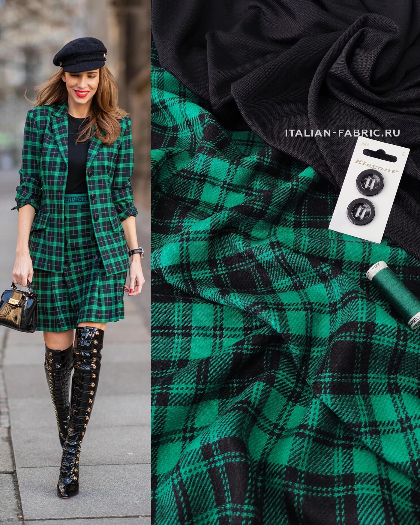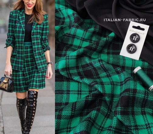 Прекрасный выбор для пошива костюмного ансамбля на любой сезон - костюмная ткань на основе вискозы с актуальным тартаном в черном и зеленом с ноткой бирюзового цветах. Материал очень красивый благодаря своей роскошной цветовой гамме, приятный тактильно, средней плотности, не мнется.