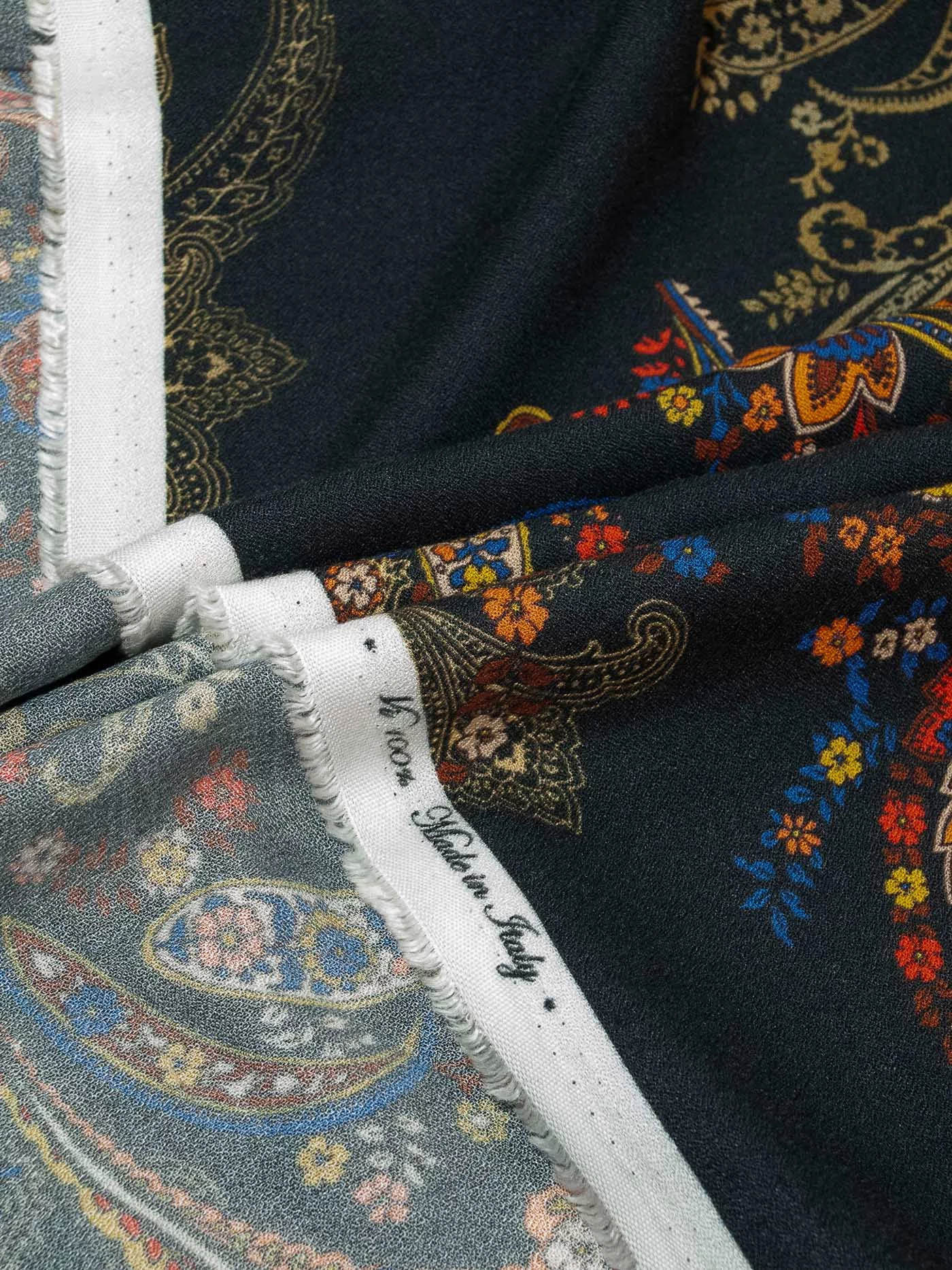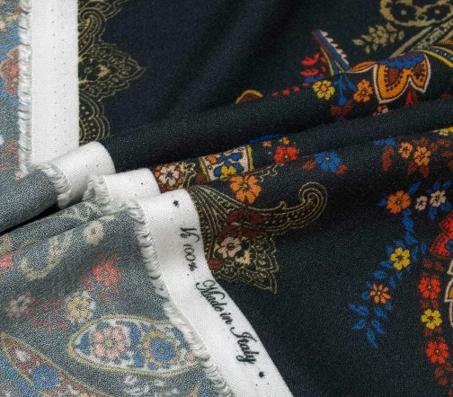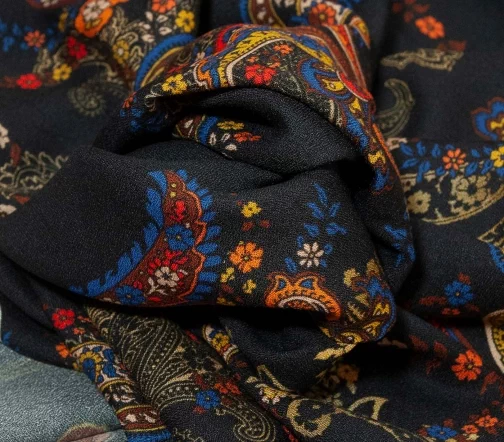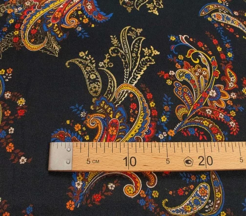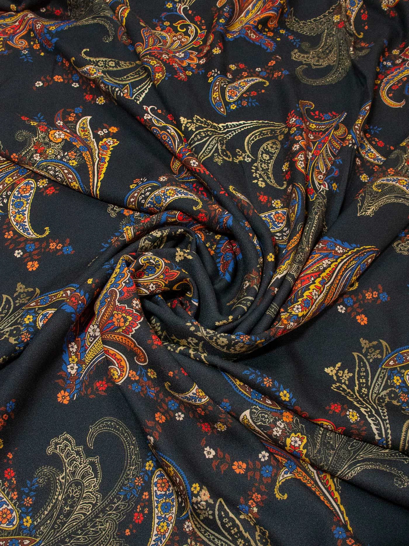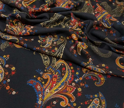 Креп с трендовым узором "восточного огурца" - пейсли в красно-желто-синем сочетании на черном фоне. Яркая, но изящная цветовая гамма и превосходное итальянское качество вискозного полотна для ваших элегантных изделий – платьев, блузок, юбок, топов, блузок, накидок.