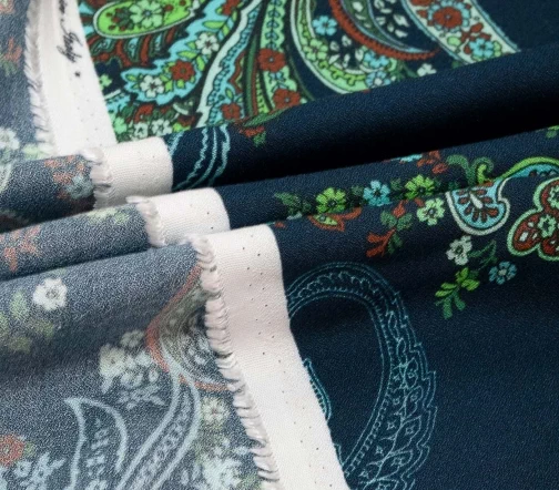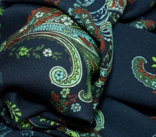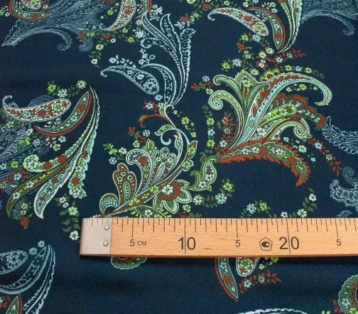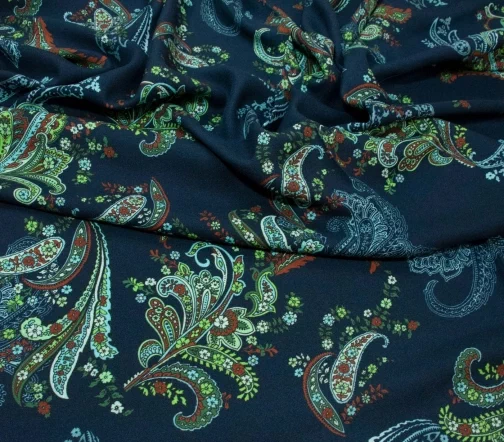Креп с трендовым узором "восточного огурца" - пейсли в коричнево-зелено-бирюзовом сочетании на темно-синем фоне. Яркая, но изящная цветовая гамма и превосходное итальянское качество вискозного полотна для ваших элегантных изделий – платьев, блузок, юбок, топов, блузок, накидок.