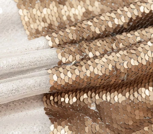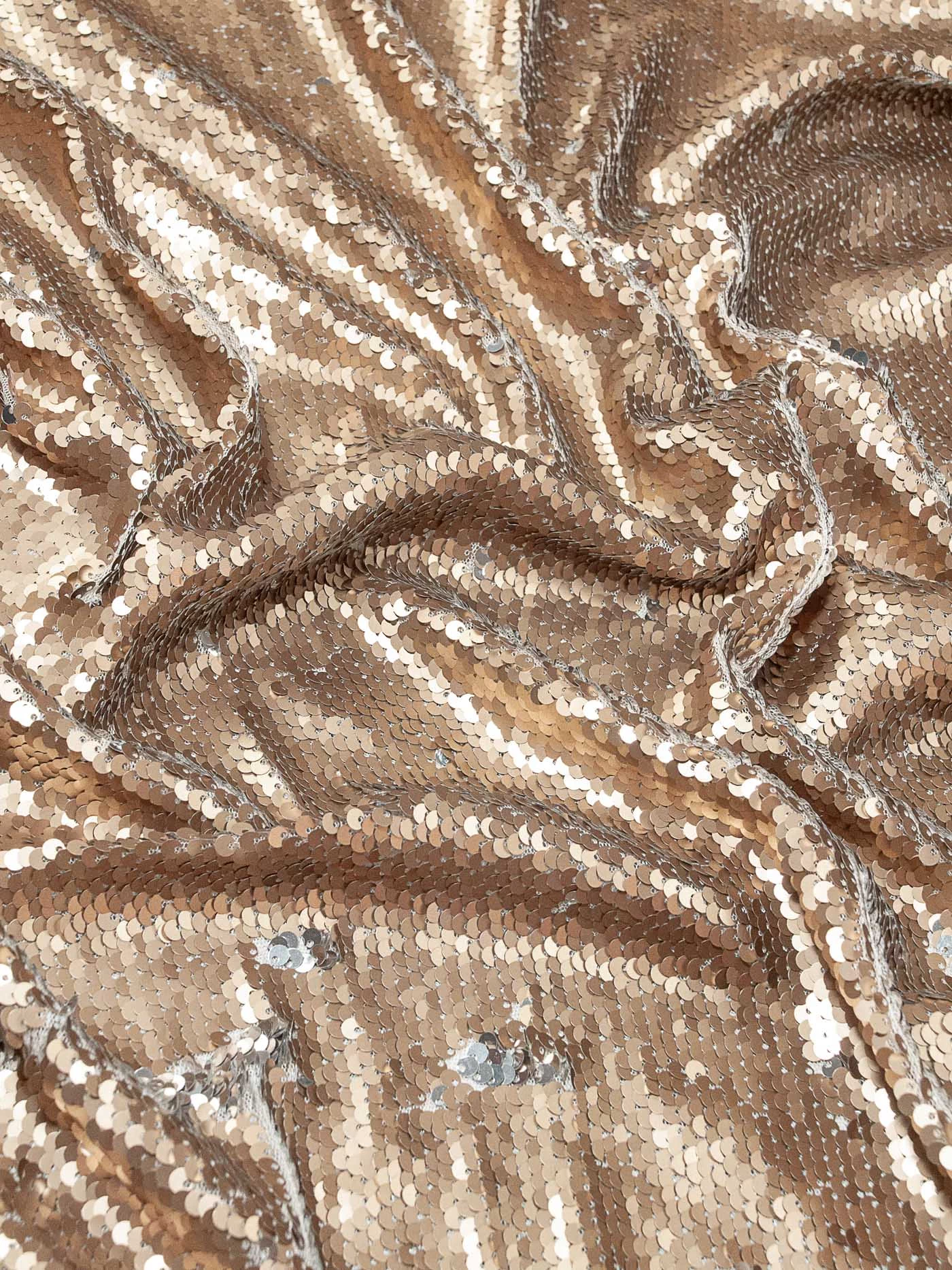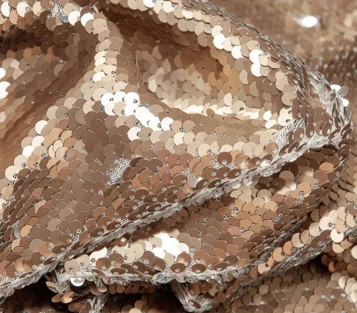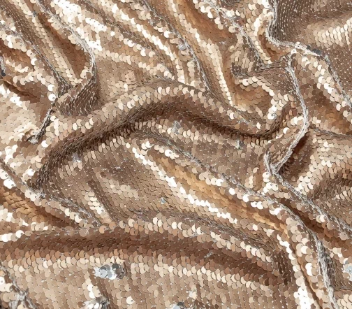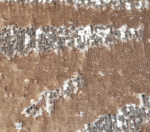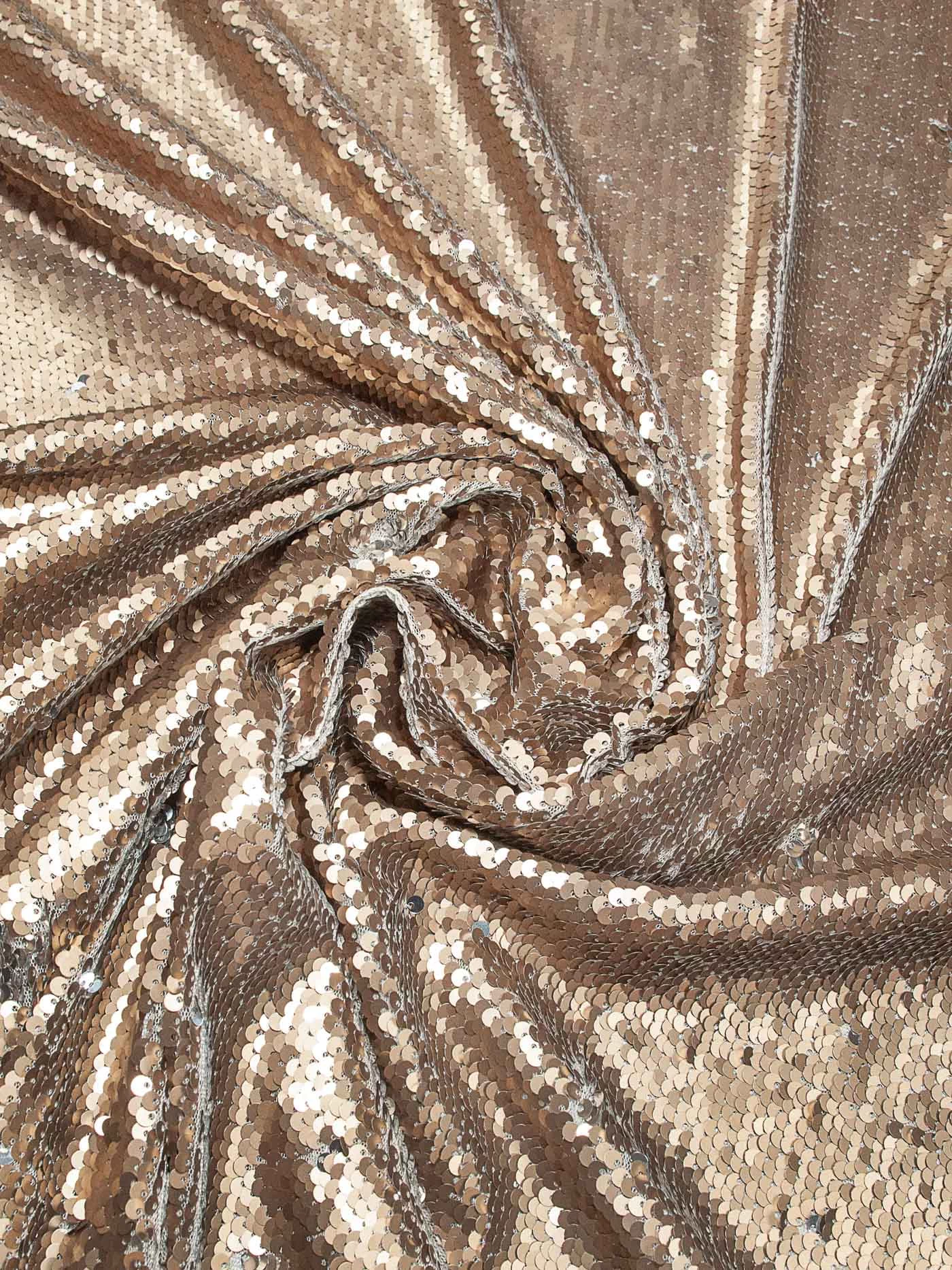 Ткань с двусторонними (flip) пайетками (медь/зеркальное серебро) диаметром 4 мм. Основа - трикотажная сетка. Рабочая ширина 130 см. Для пошива роскошных топов, платьев, юбок, а также в качестве компаньона к бархату, велюру, шелку, футеру и др. тканям. И, конечно, для декорирования отдельных элементов одежды для придания индивидуального стиля.