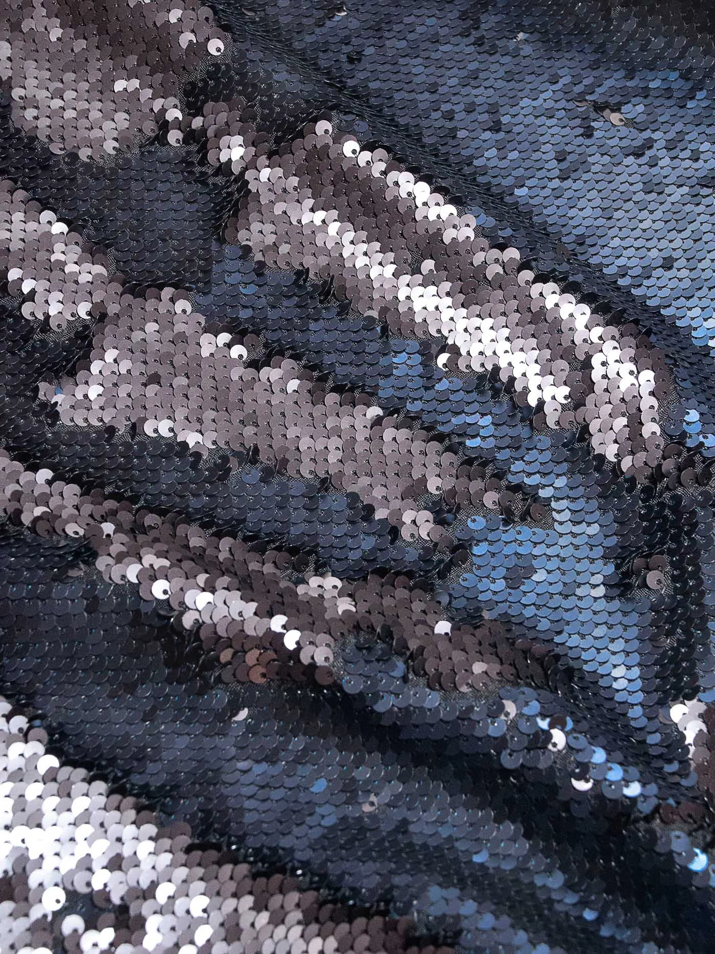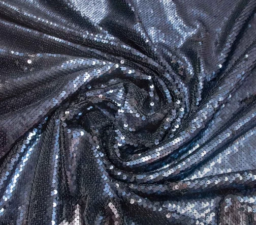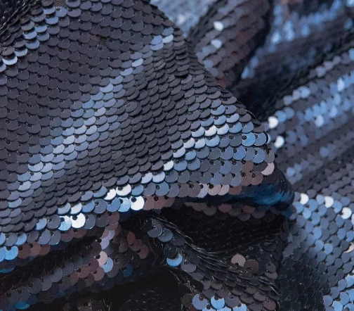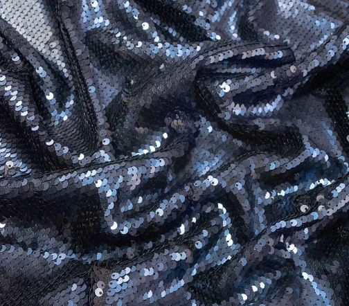 Ткань с двусторонними (flip) пайетками (темно-синий/черный) диаметром 4 мм. Основа - трикотажная сетка. Рабочая ширина 130 см. Для пошива роскошных топов, платьев, юбок, а также в качестве компаньона к бархату, велюру, шелку, футеру и др. тканям. И, конечно, для декорирования отдельных элементов одежды для придания индивидуального стиля.