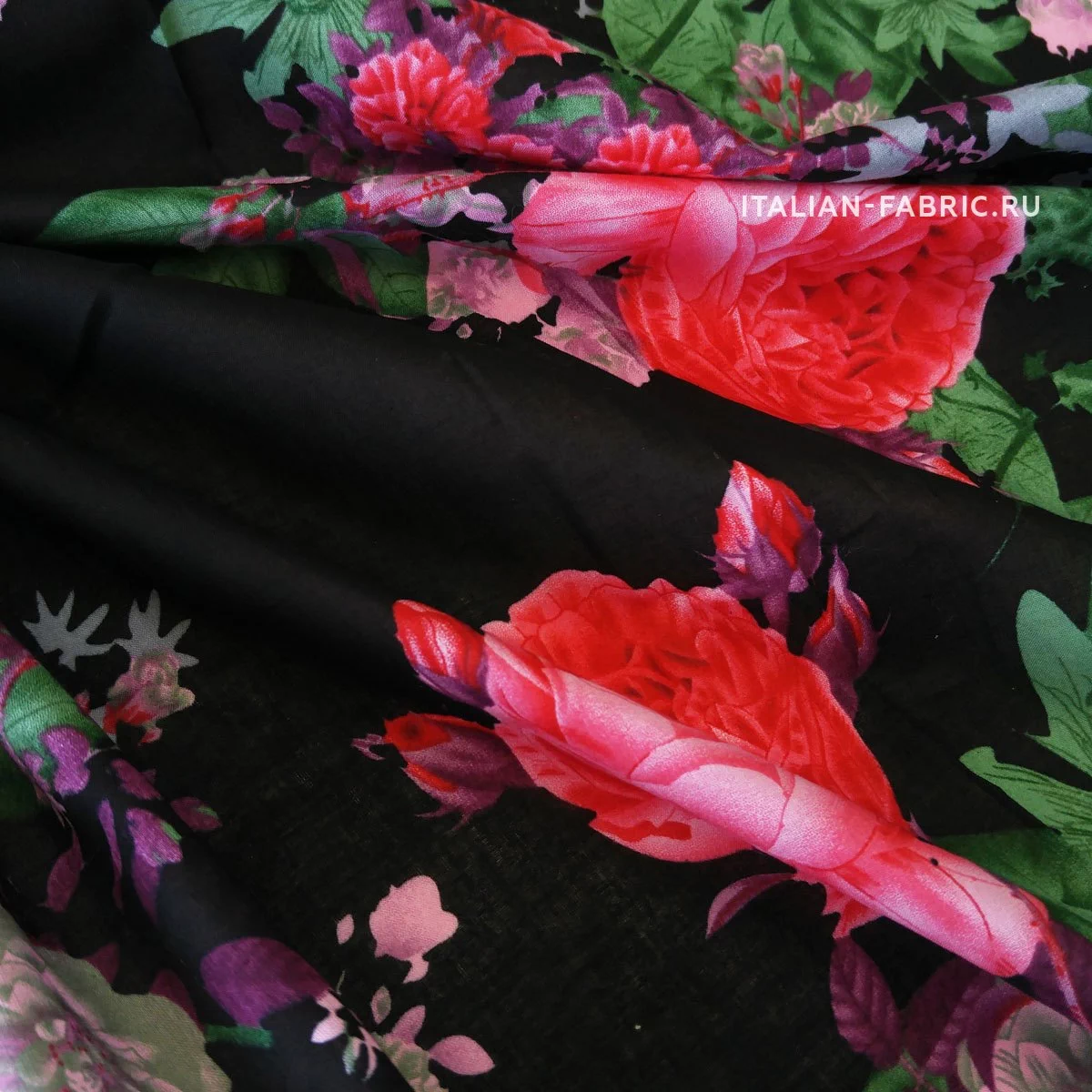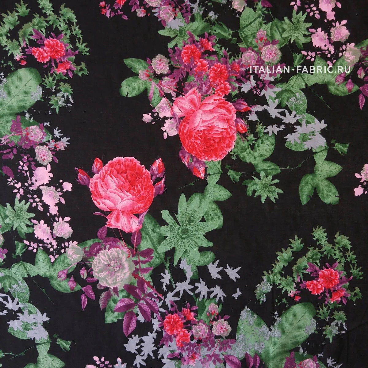 На классическом черном фоне красные розы и клематисы в изумрудных оттенках. Просвечивает.