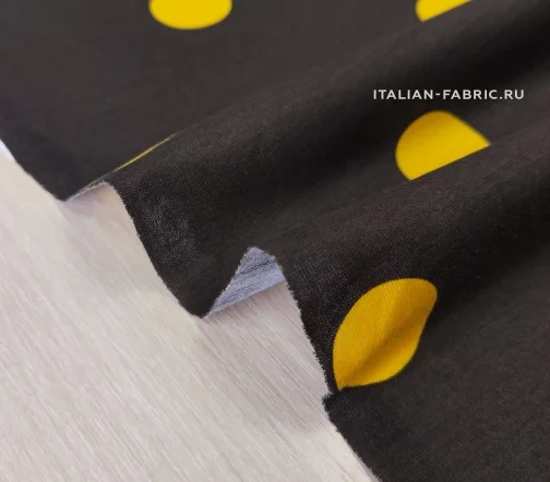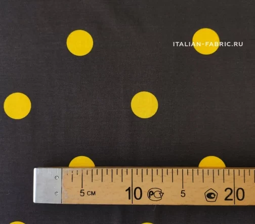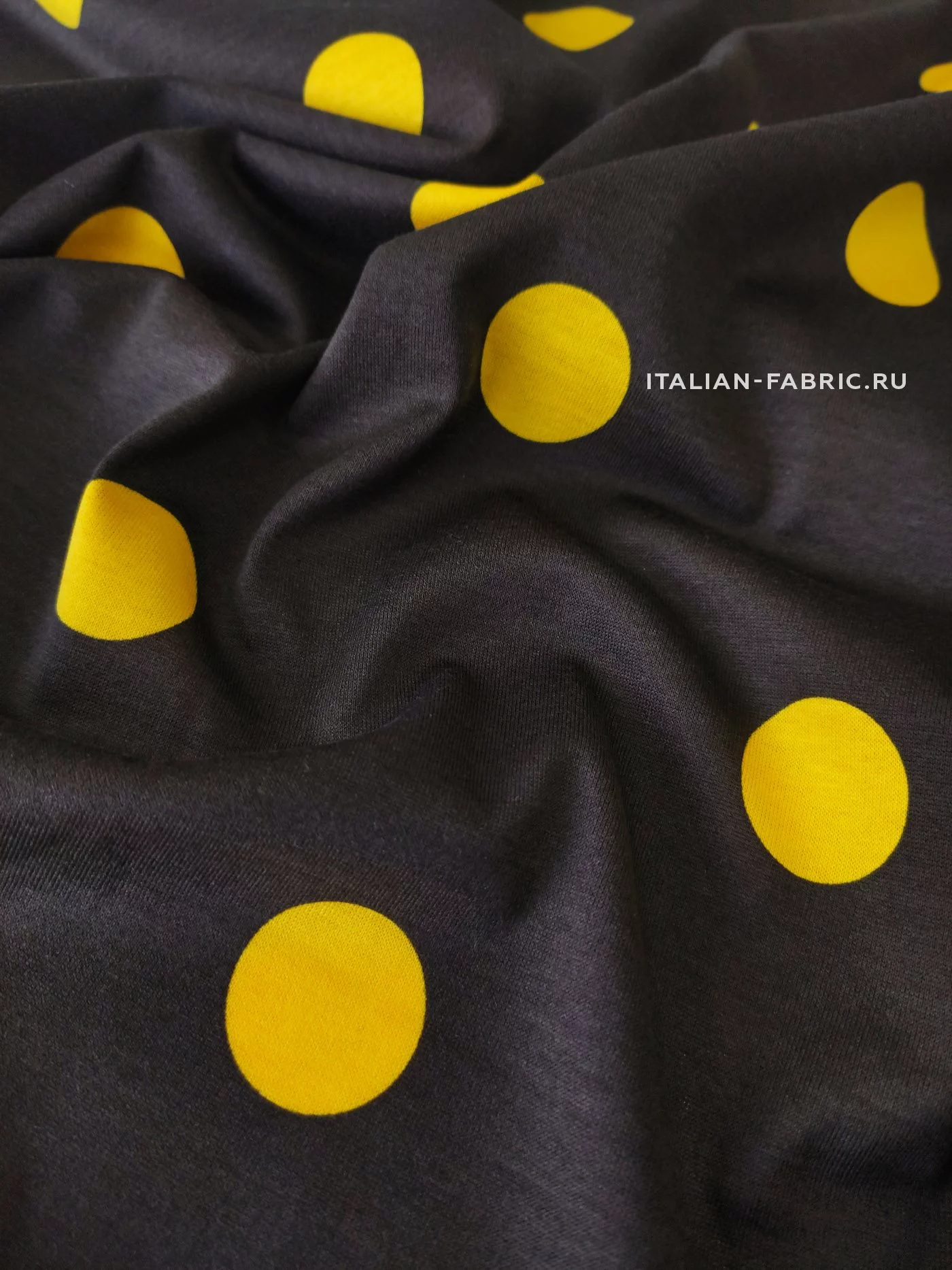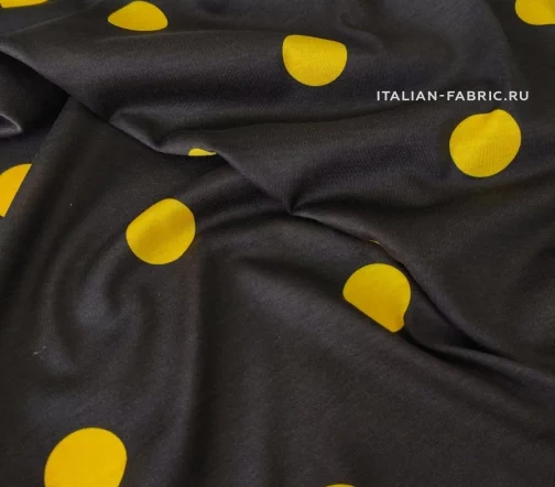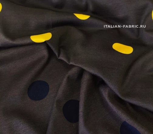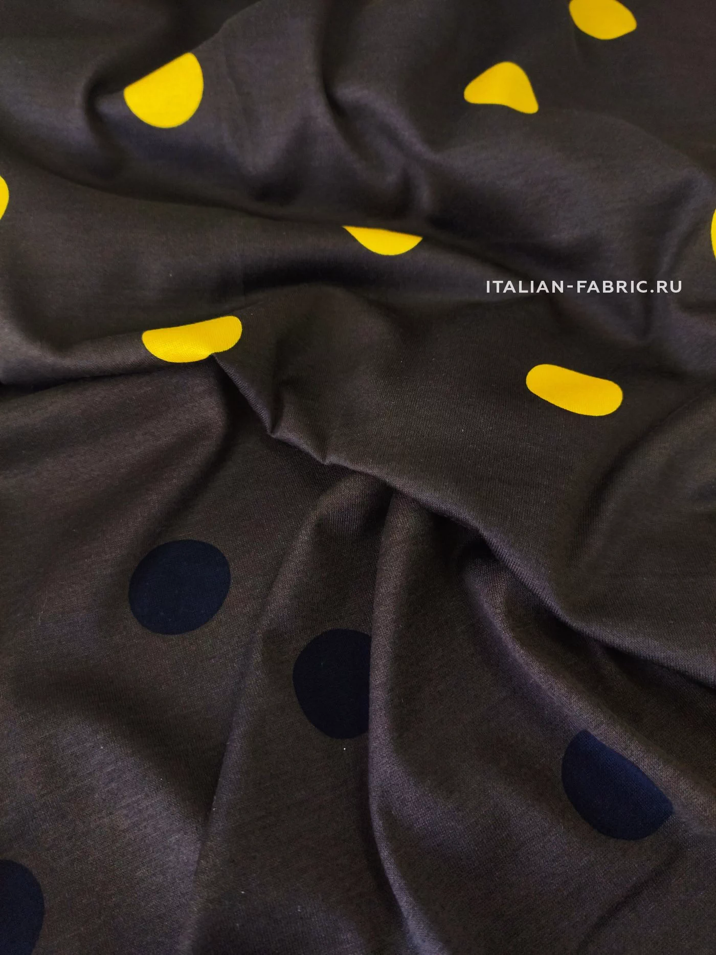 Горох, как один из самых стильных принтов этого года, представлен на подиумах в самых интересных цветовых решениях. Для пошива поло, лонгсливов и платьев с этим актуальным принтом в наличии итальянский трикотаж цвета темного хаки с контрастными ярко-желтыми горошинами. Диаметр горошин – 27 мм. Материал пластичный, мягкий, приятный к коже.