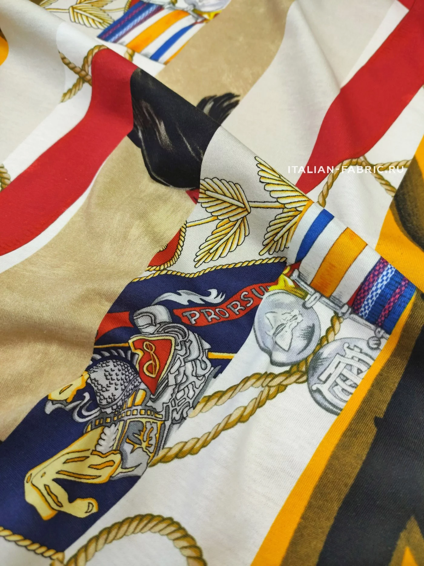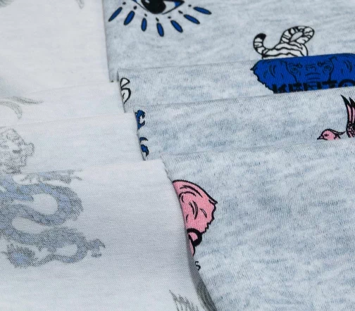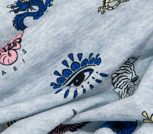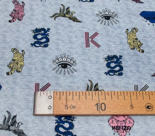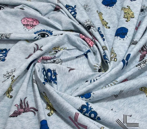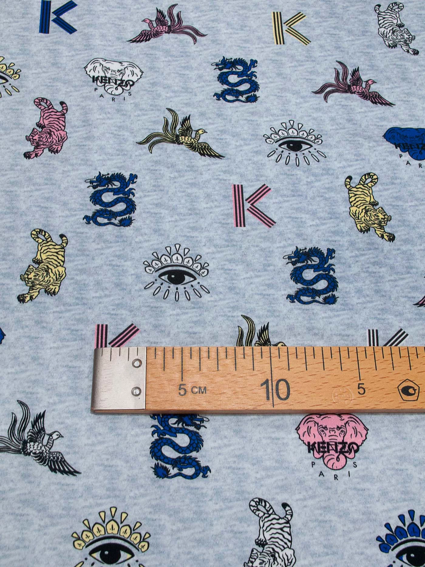 Легкий трикотаж с мелким повторяющимся принтом животных и заглавной буквой K. Подойдет для пошива на футболки, водолазки и спортивной одежды.