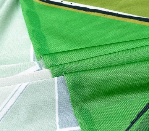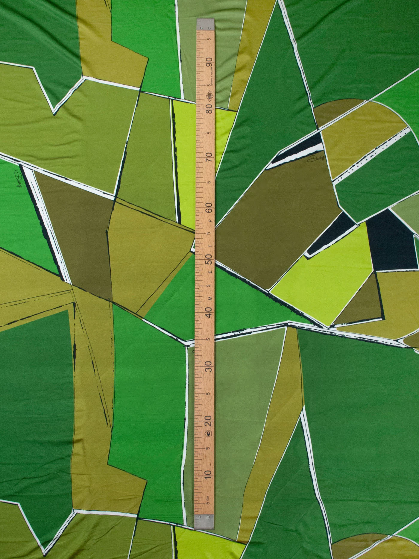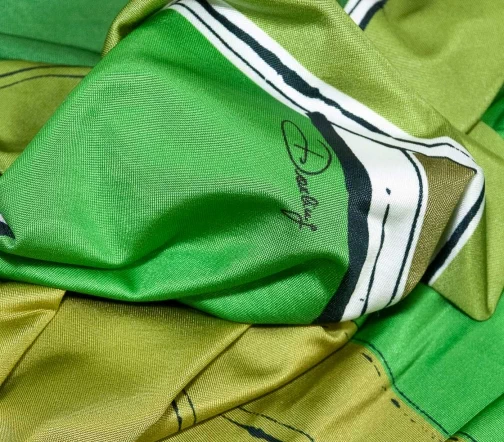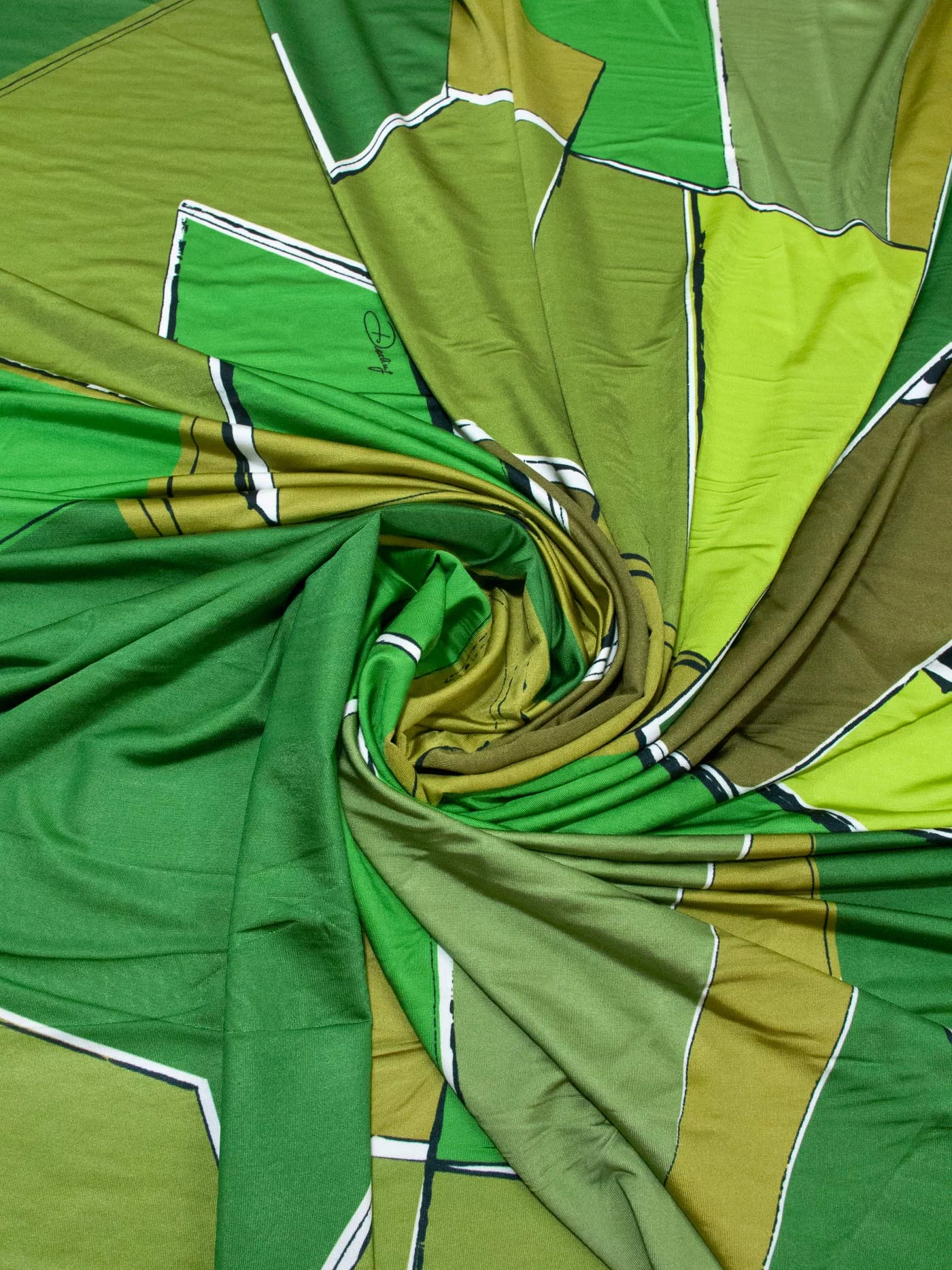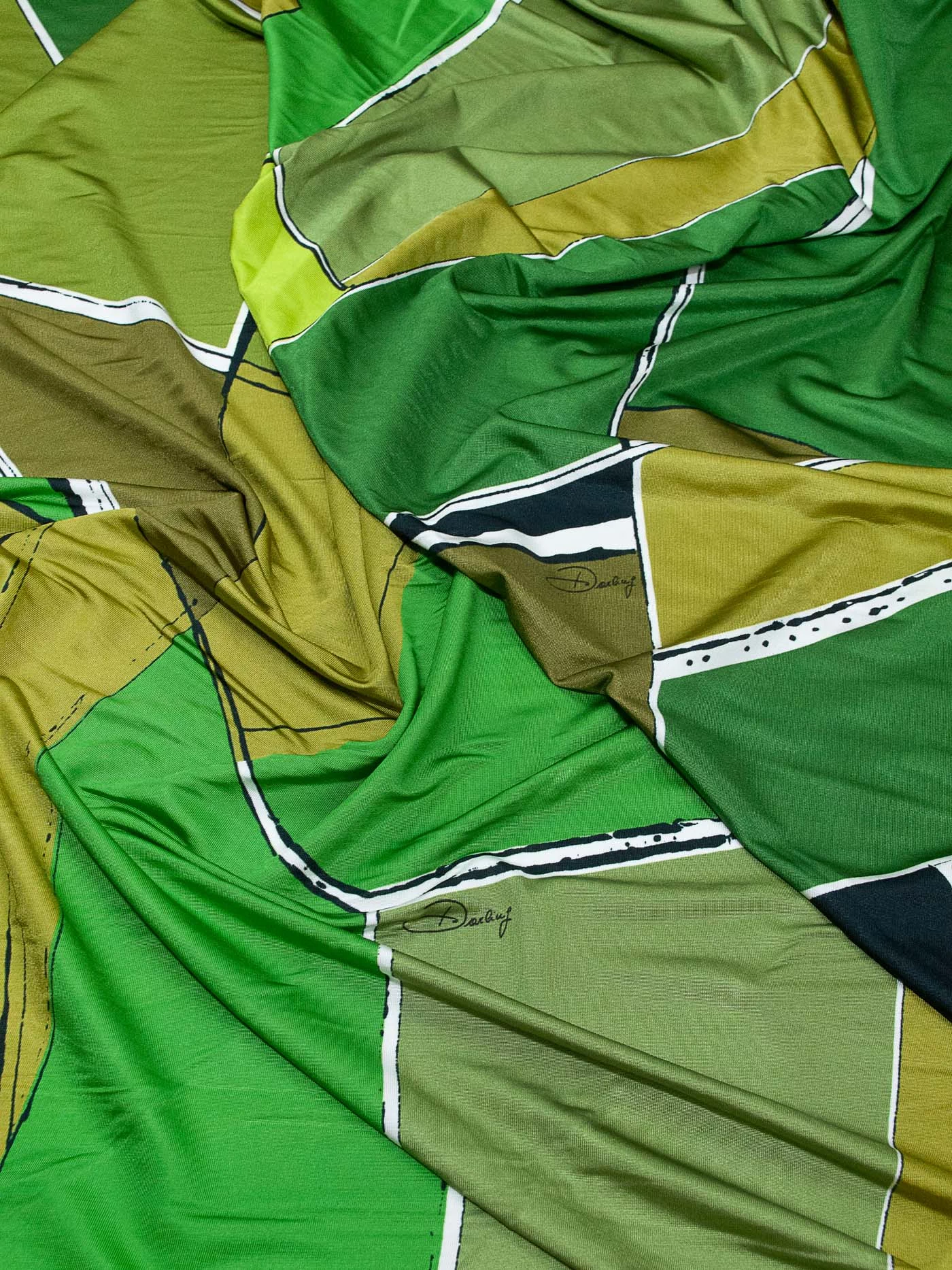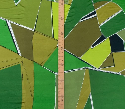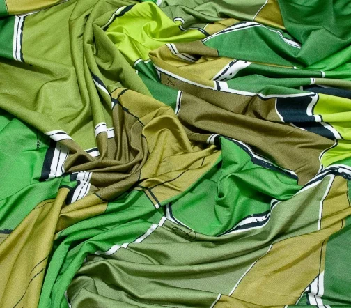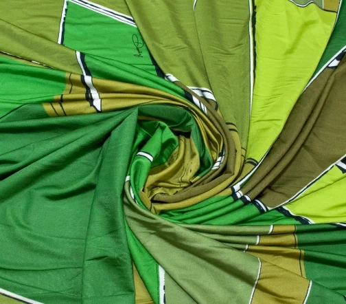 Стильный трикотаж масло с динамичным геометрическим рисунком в зеленых оттенках. Материал с легким блеском, пластичный, средней плотности, приятный тактильно и гигроскопичный благодаря вискозному составу. Идеально подходит для пошива топов, футболок, водолазок, лонгсливов, легинсов.