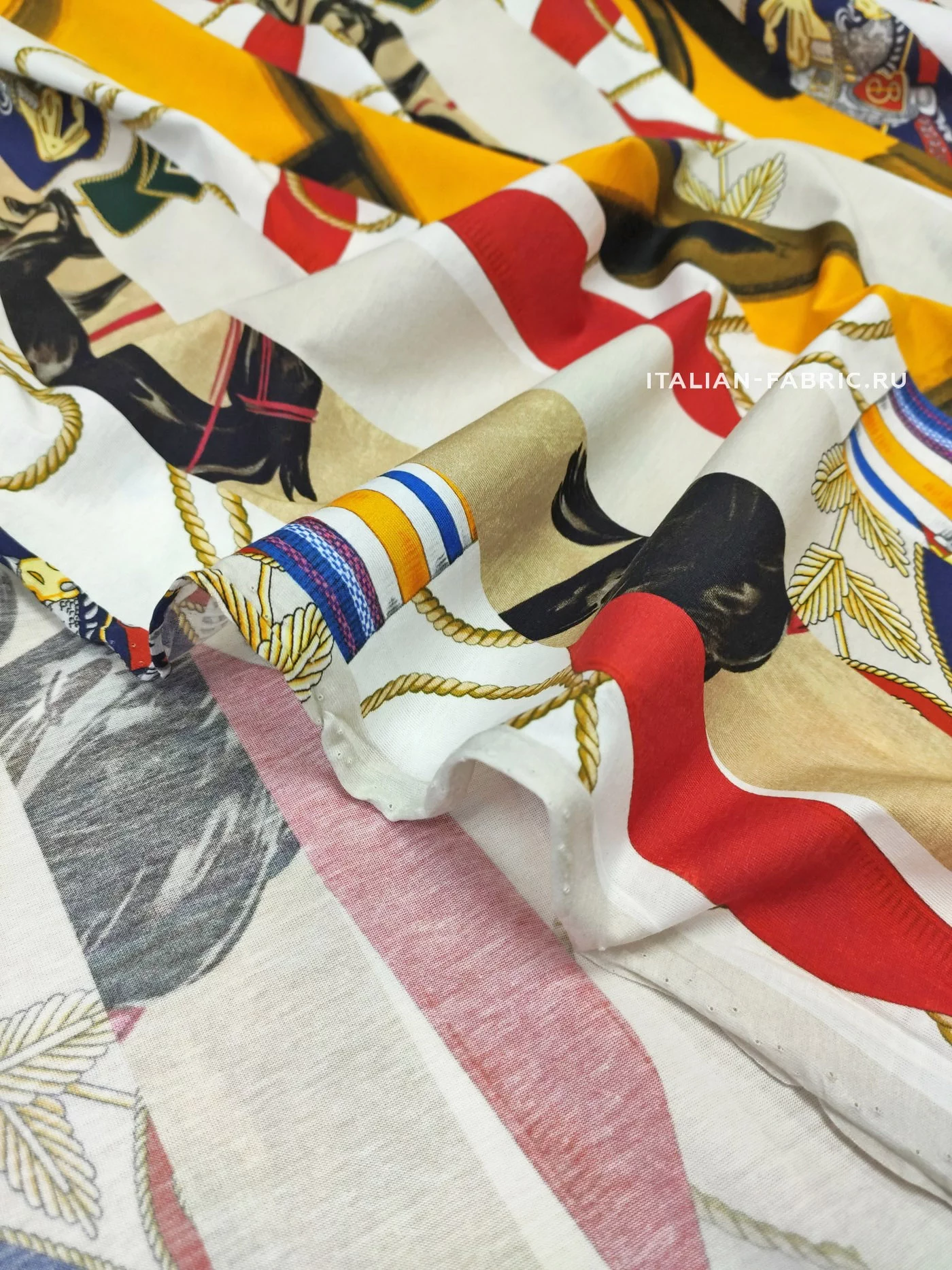 Изумительный трикотаж Burberry. Авангардный принт, сочетающий контрастные узоры, полосы в стиле колорблокинг, геральдические элементы и фирменную эмблему бренда – рыцаря на коне. Логотип Модного дома виртуозно включен в принт и изображен на рыцарском щите, а также в виде крупных буквенных монограмм, которые идут паттернами на заднем плане изображения.