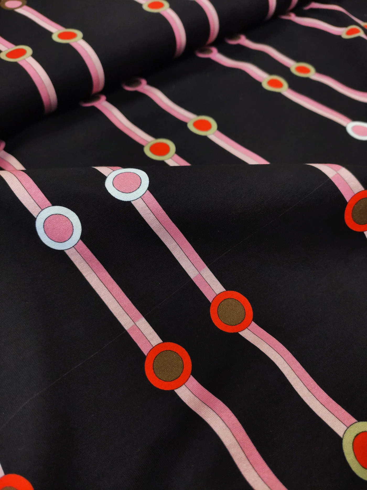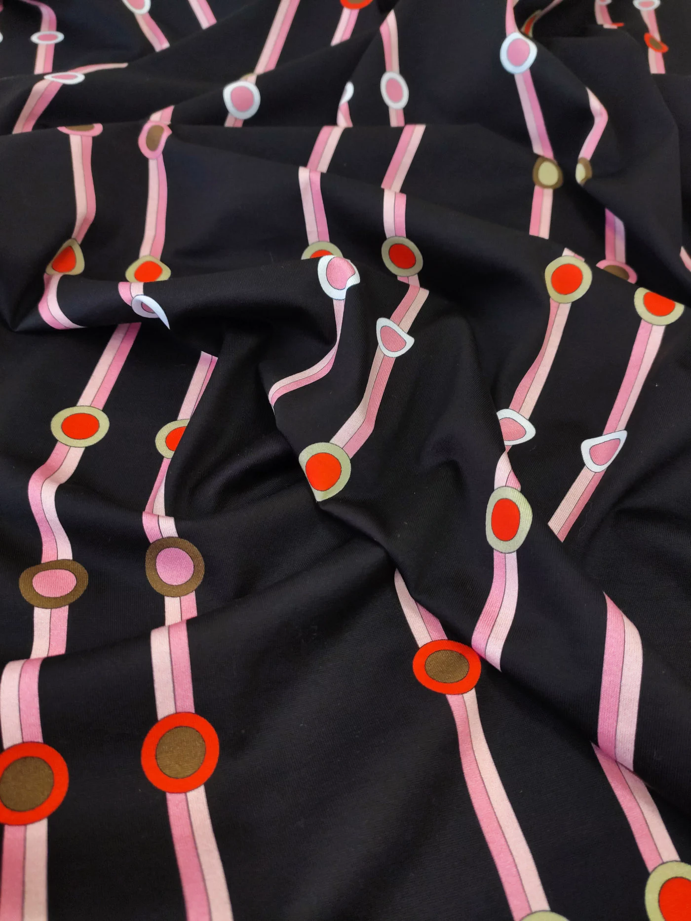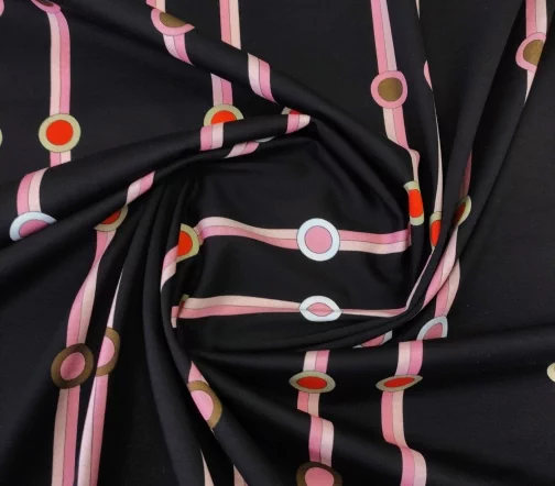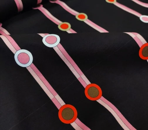 Геометрические принты не сдают своих топов позиций. Четкие линии, абстрактные рисунки, сочные цвета – любые геометрические принты полны динамизма и стиля. Трикотаж с вертикальными розовыми полосами на темно-коричневом в черный фоне идеально подойдет для пошива стильных лонгсливов, футболок и платьев.