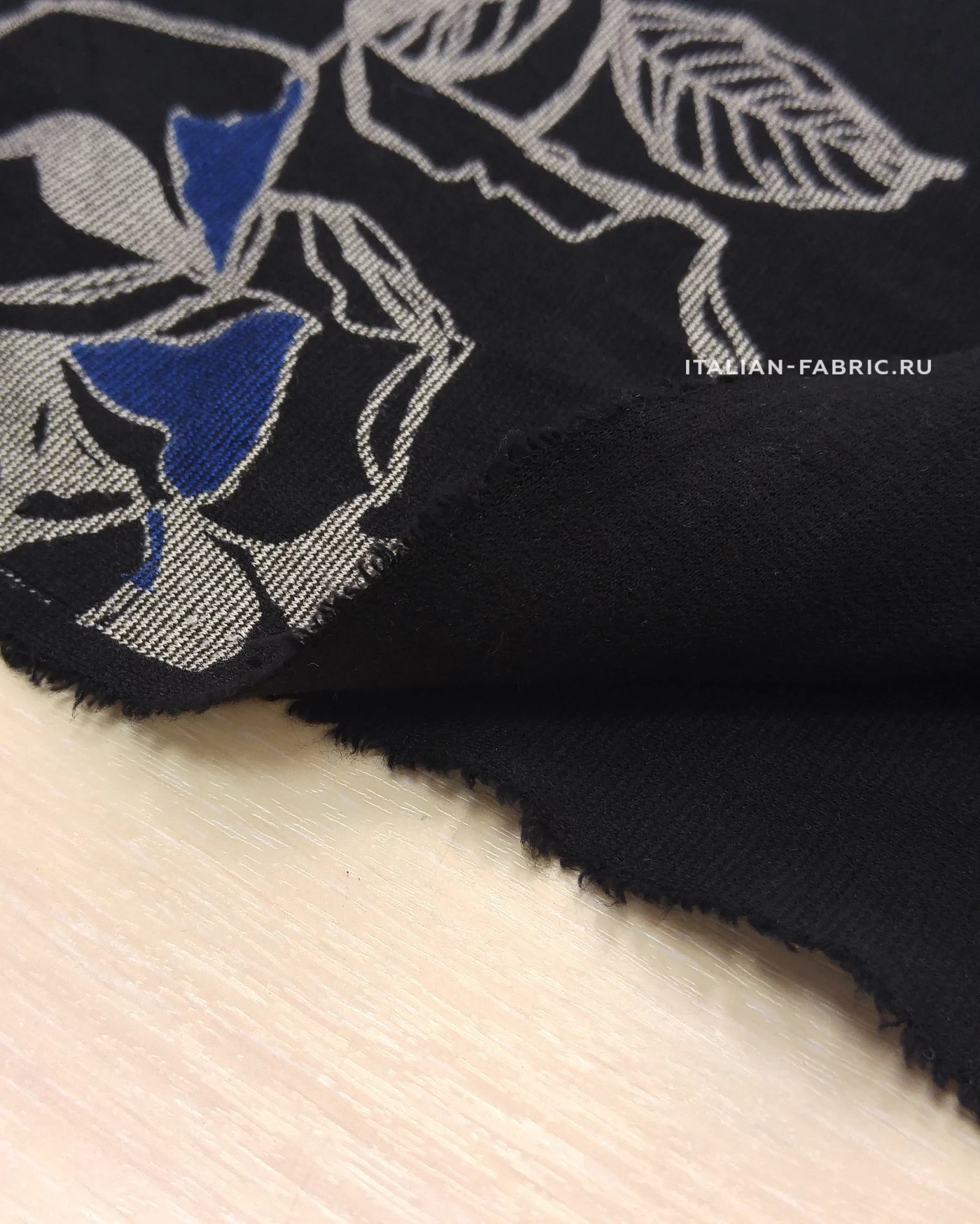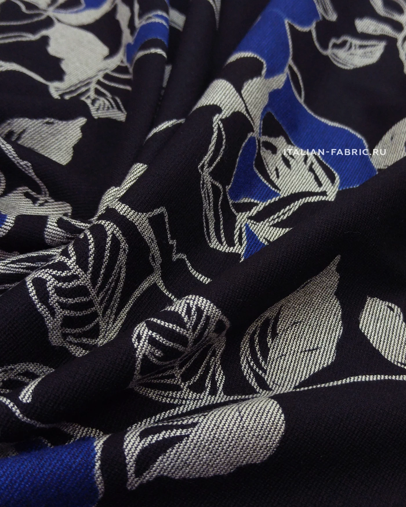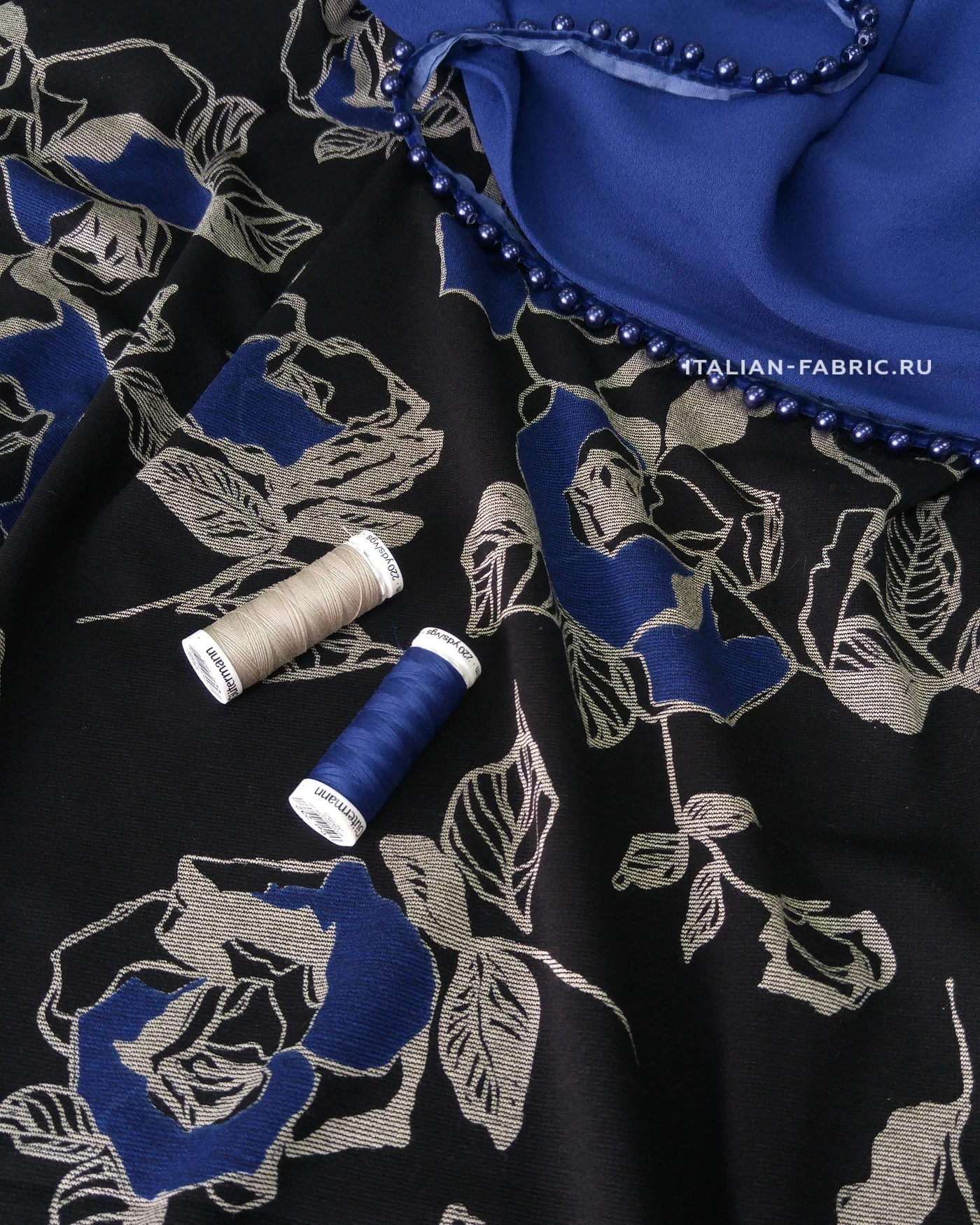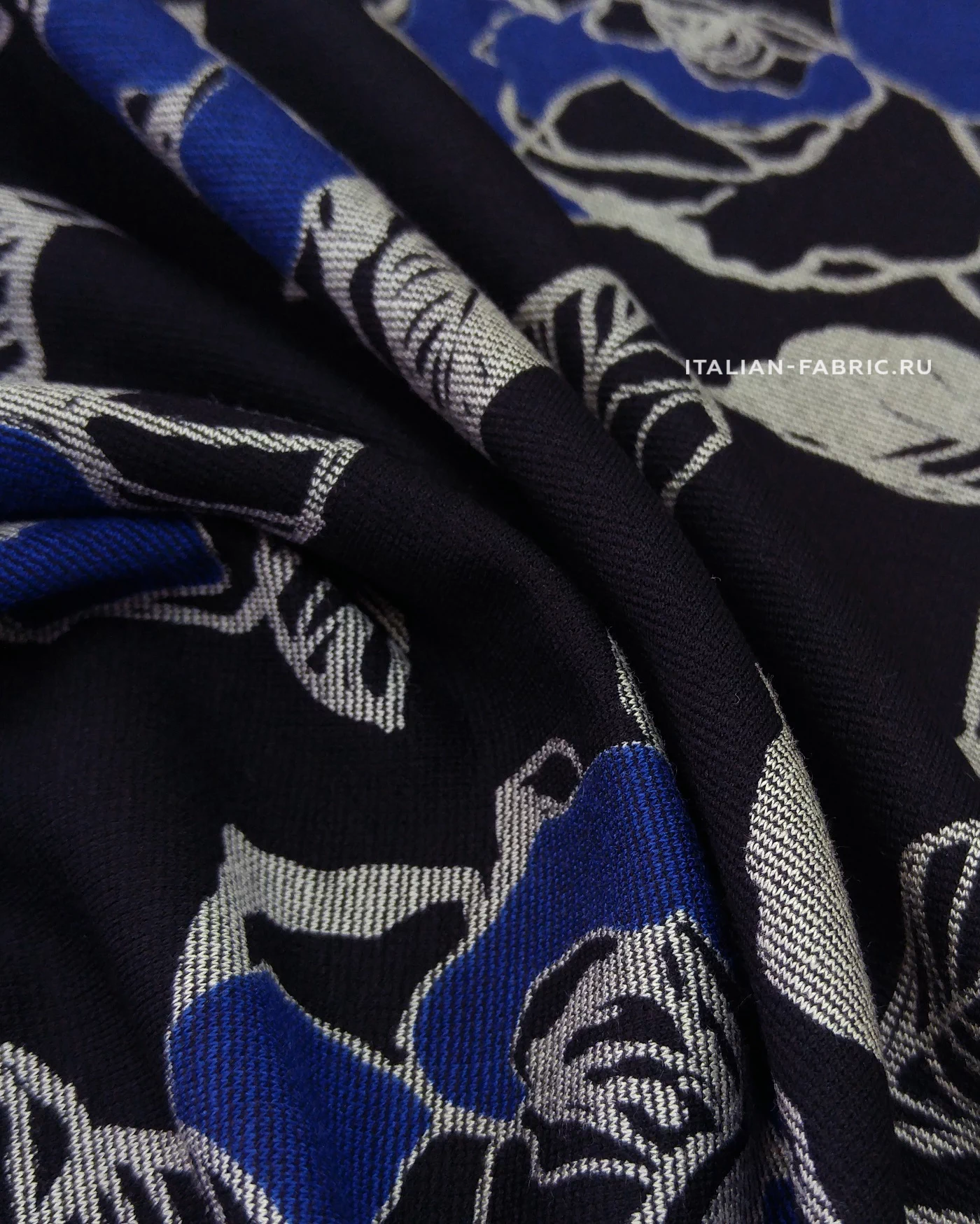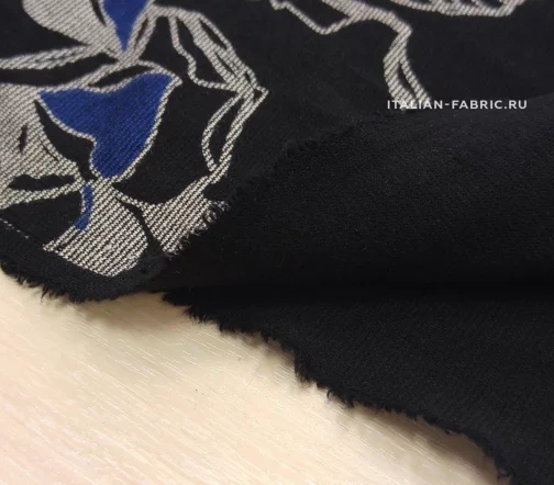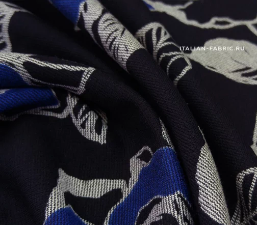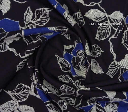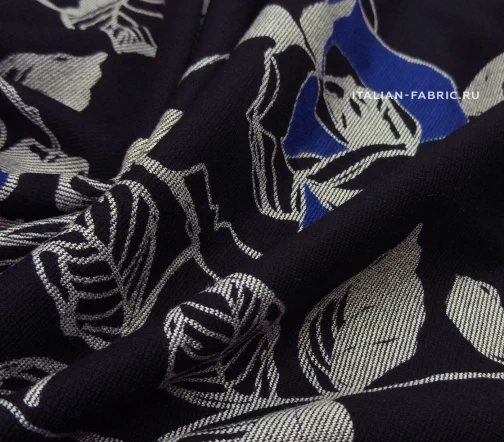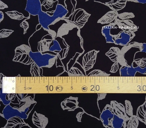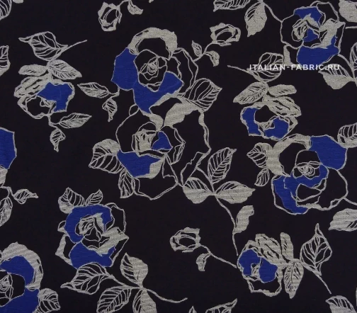 Для пошива свитшотов, худи, спортивных костюмов, а также платьев и юбок рекомендуем джерси с красивыми крупными графичными розами в сине-серых цветах. Размер цветков: 8 – 13 см.