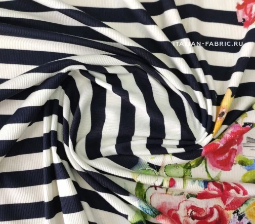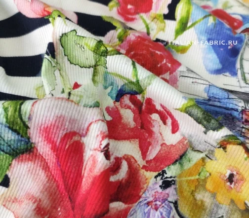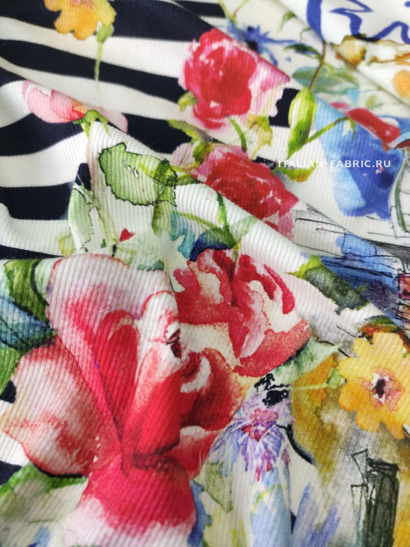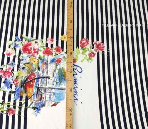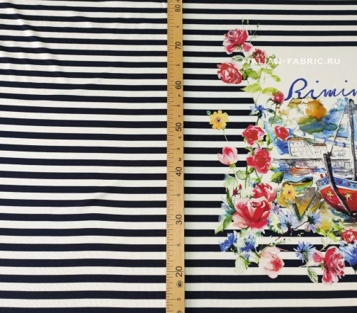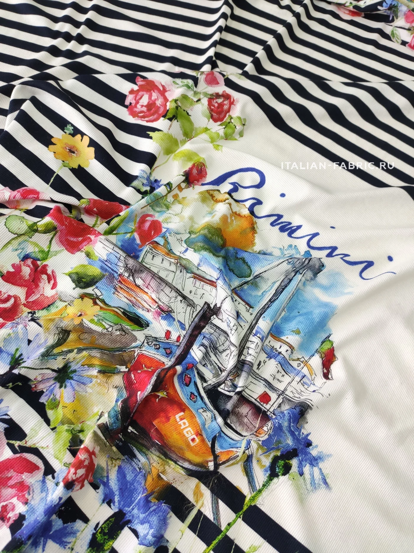 Стильный трикотаж с горизонтальной полоской и акварельным рисунком, живописно изображающим пристань итальянского города Римини в цветочном обрамлении. Очень красивый материал, пластичный, приятный тактильно, средней плотности. Для пошива лонгсливов и поло.