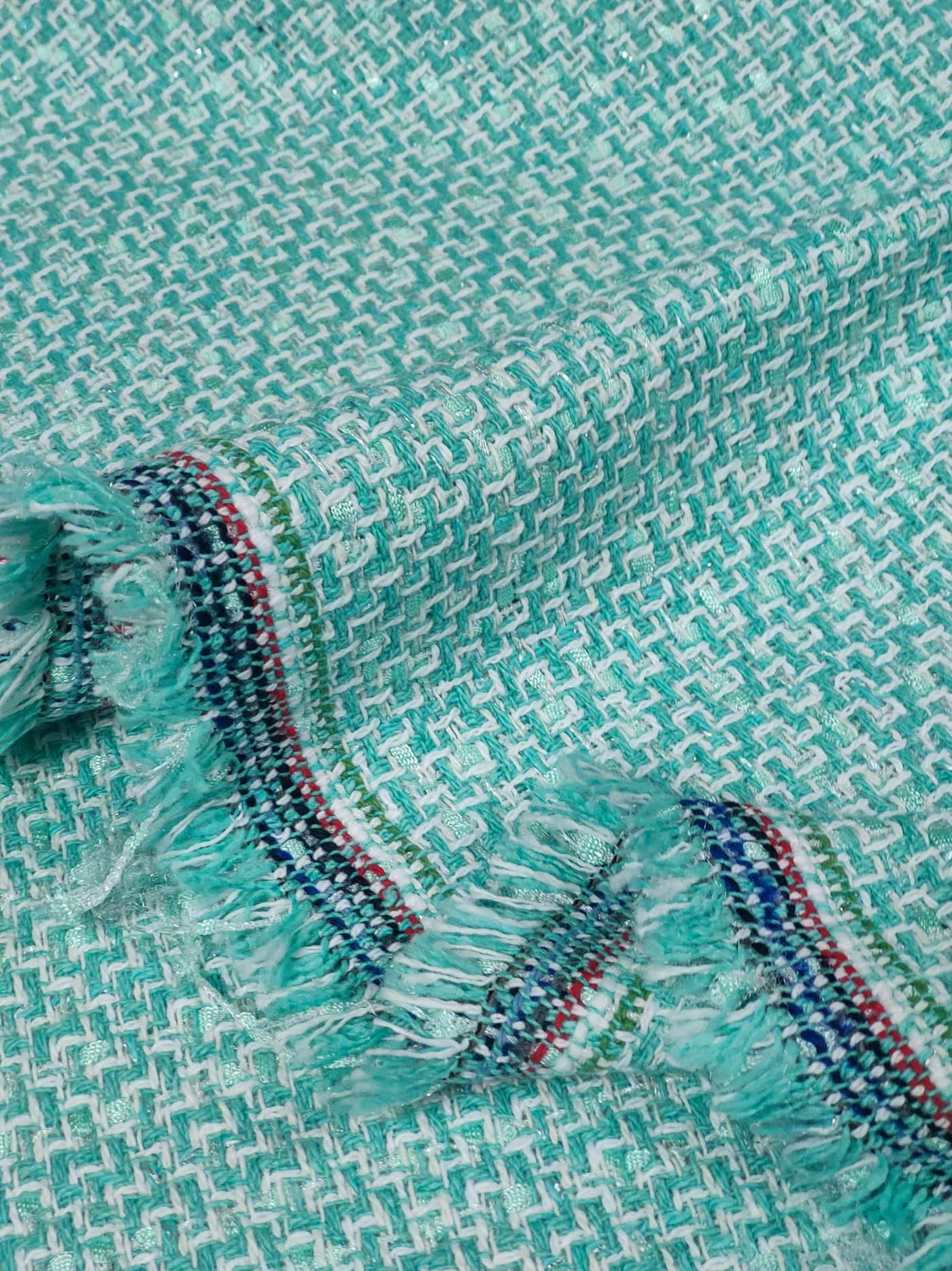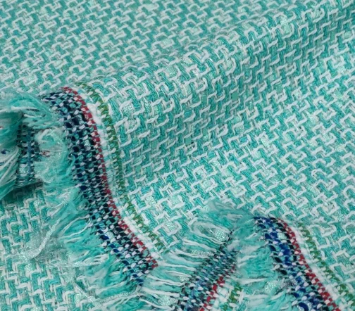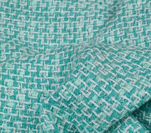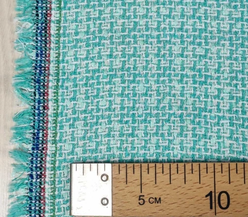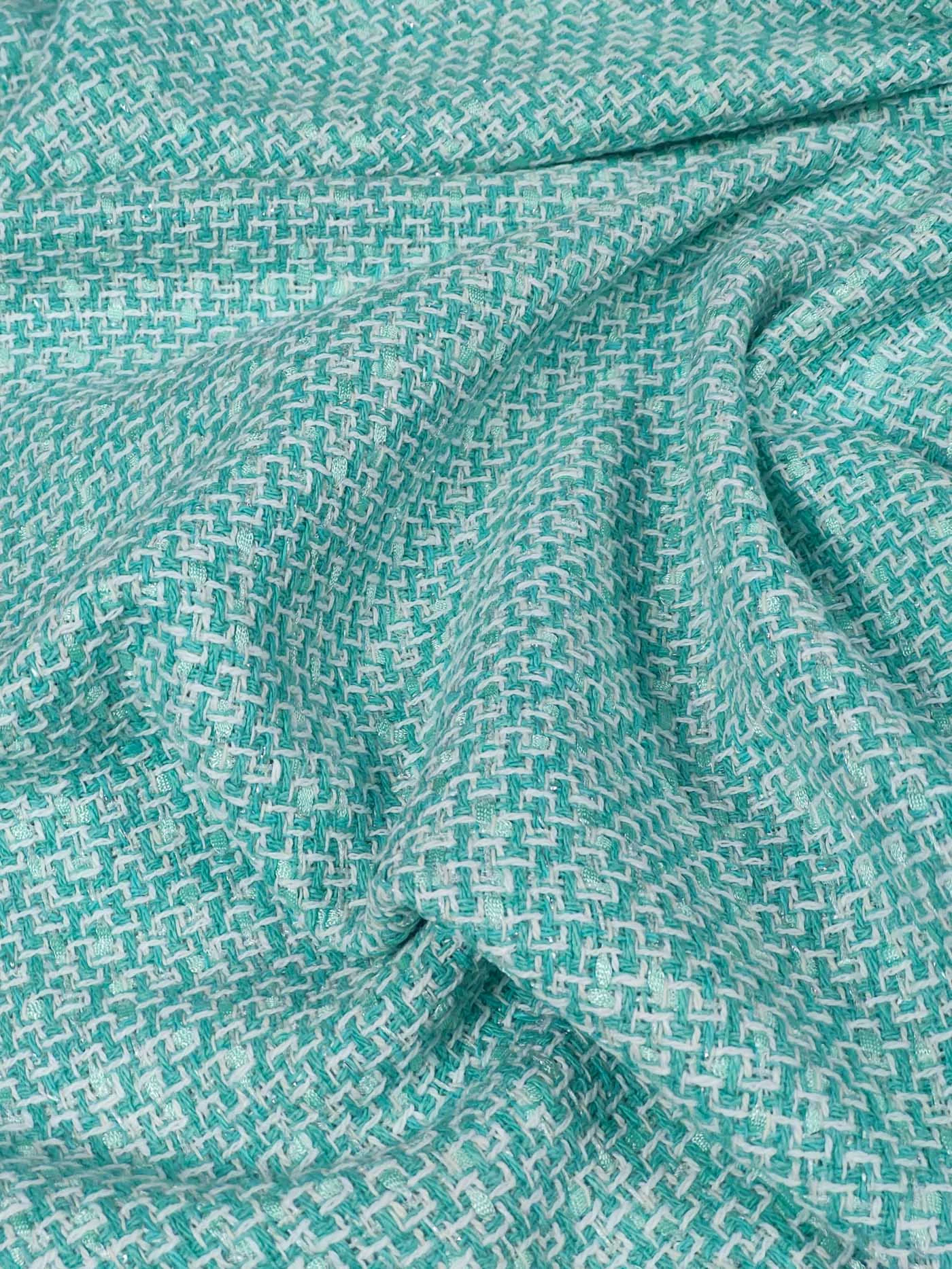 Облегченный хлопковый твид в стиле шанель с вплетенными в основу вискозными нитями-ленточками. Нежный светло-зеленый с салатовыми нитями и люрексом серебро.