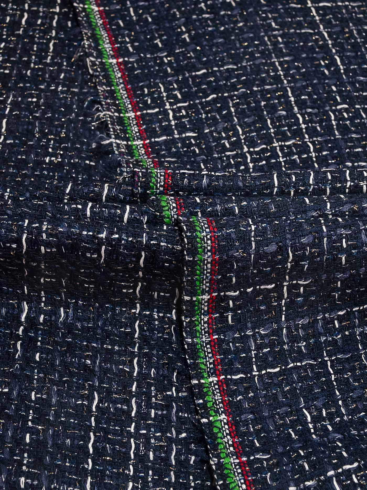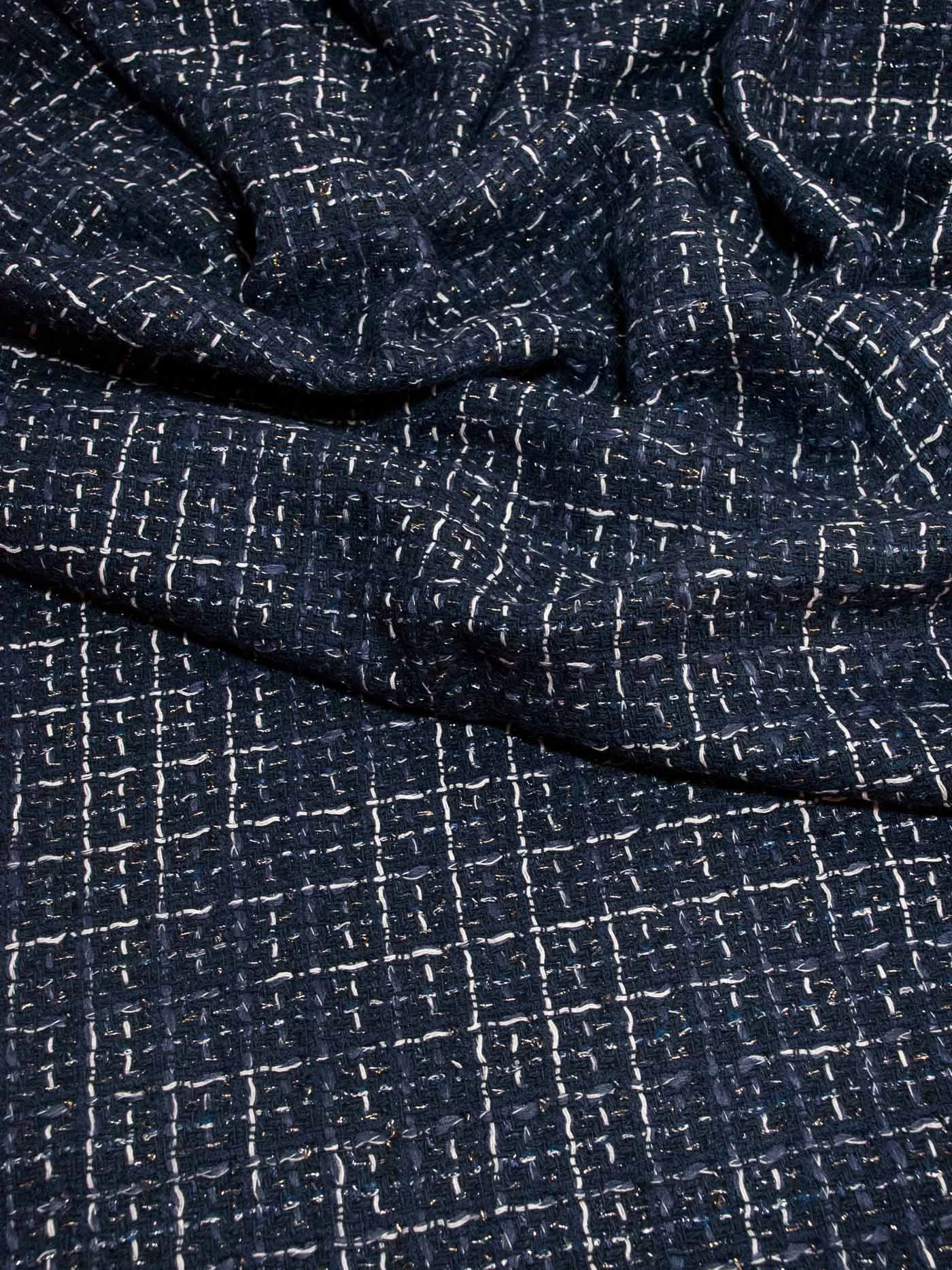 Полотно фирменной фактуры в деловом бело-сливочном сочетании с деликатно играющими на свету серебристыми нитями люрекса. За счет смесового состава идеально подойдёт на жакеты на подкладке, костюмы, платья и юбки.