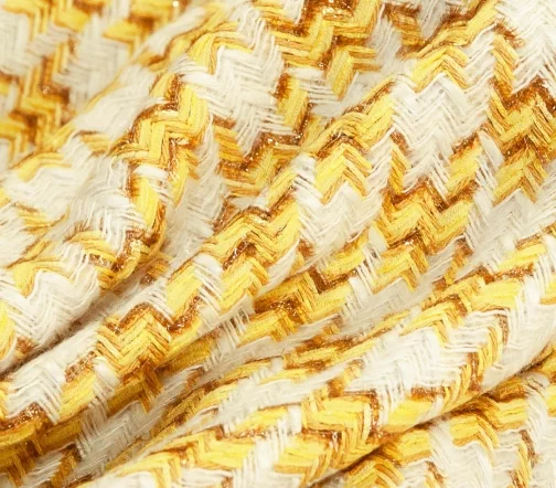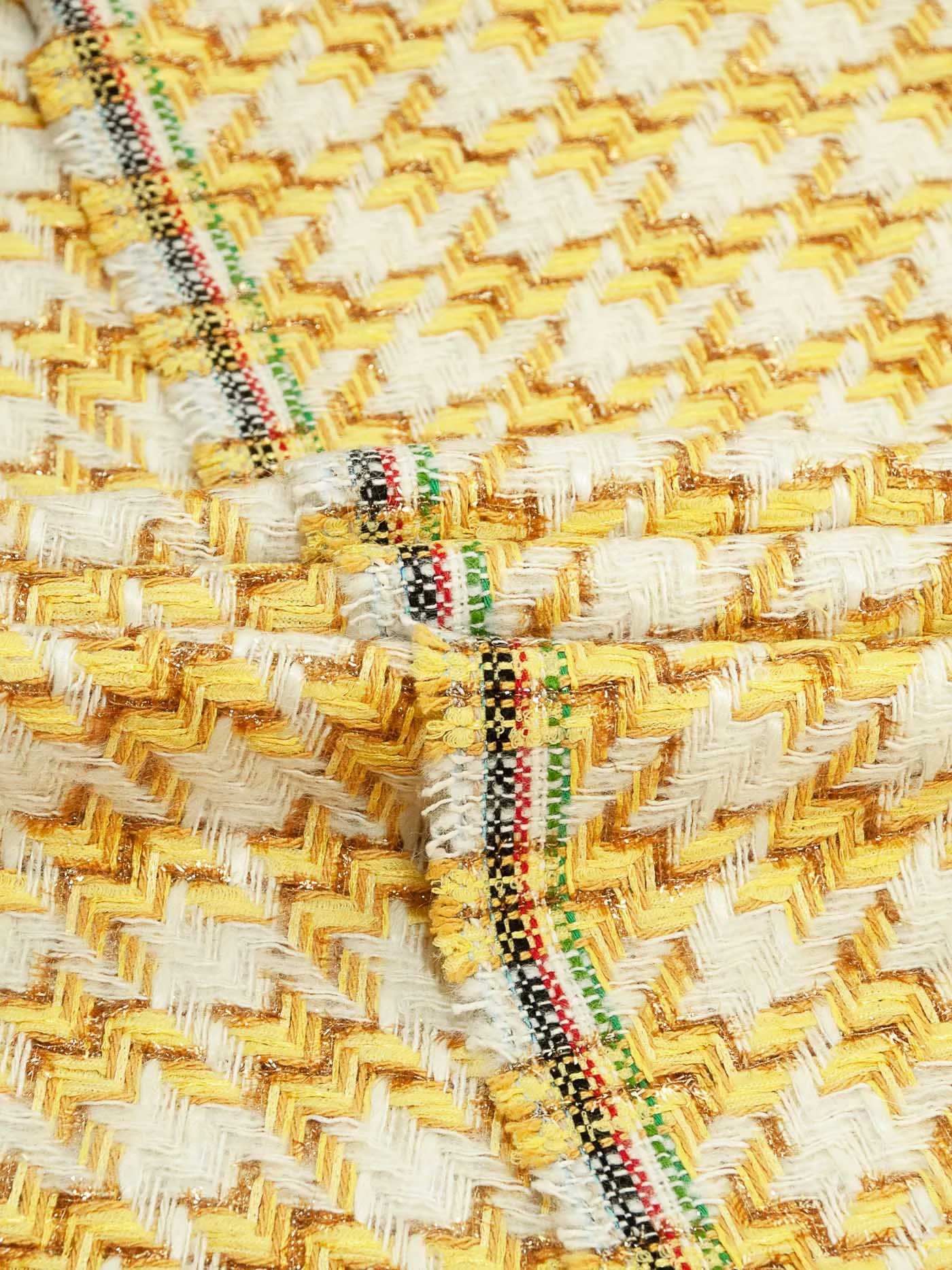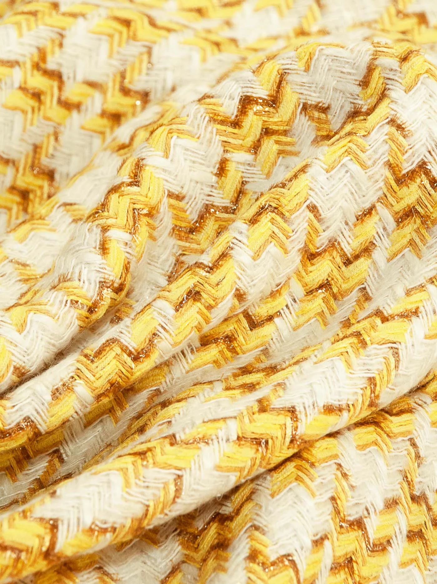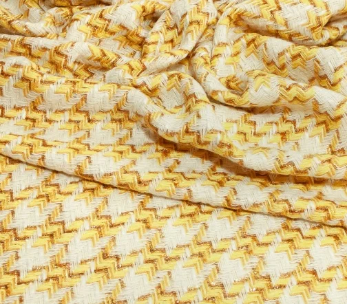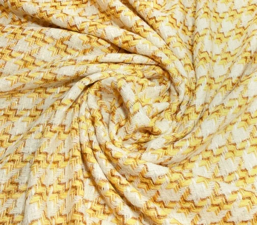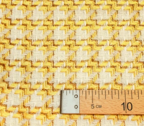 Полотно фирменной фактуры в ярком молочно-желтом сочетании трендового узора «гусиная лапка» с деликатно играющими на свету нитями метанита светло-желтого цвета. За счет смесового состава идеально подойдёт на жакеты на подкладе, костюмы, платья и юбки.