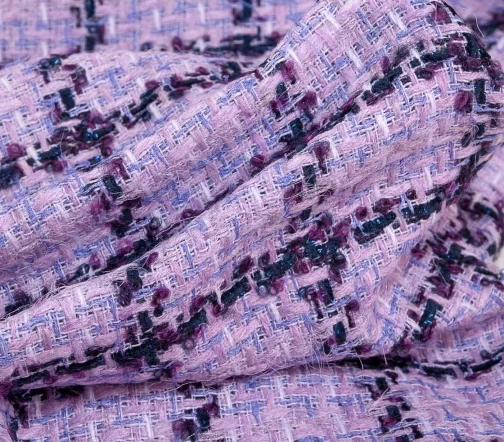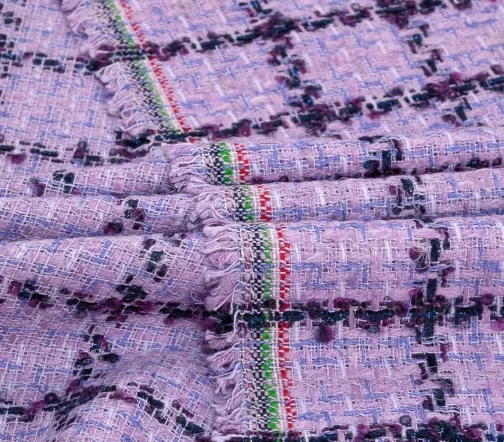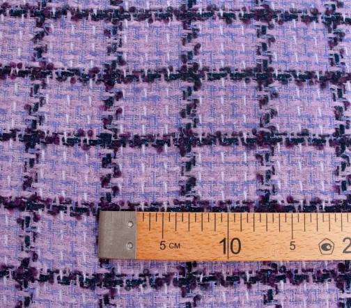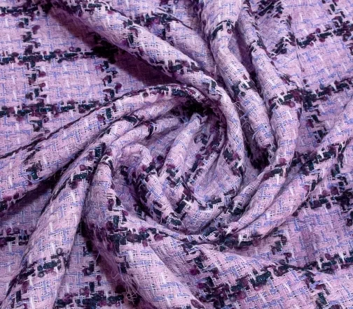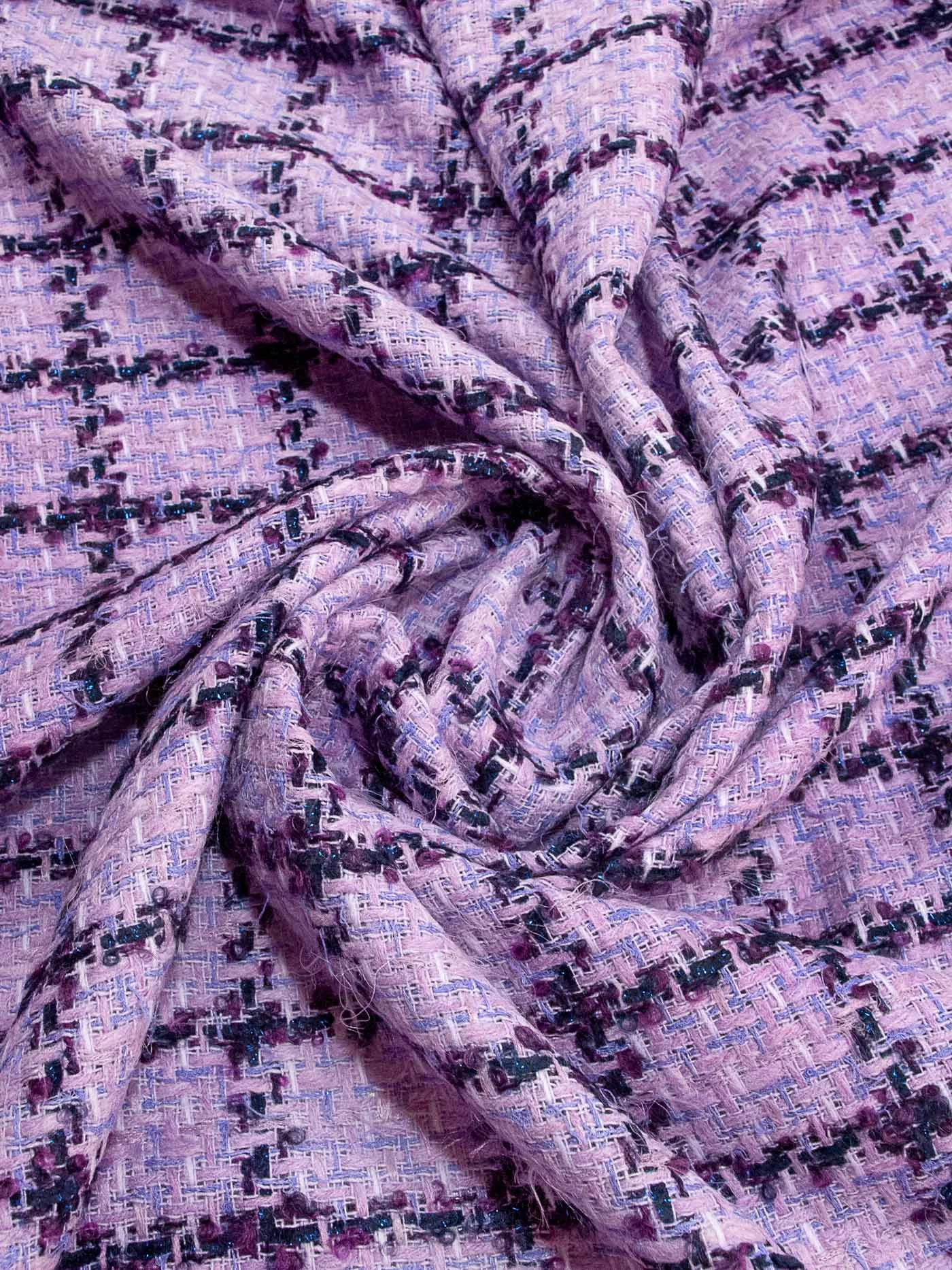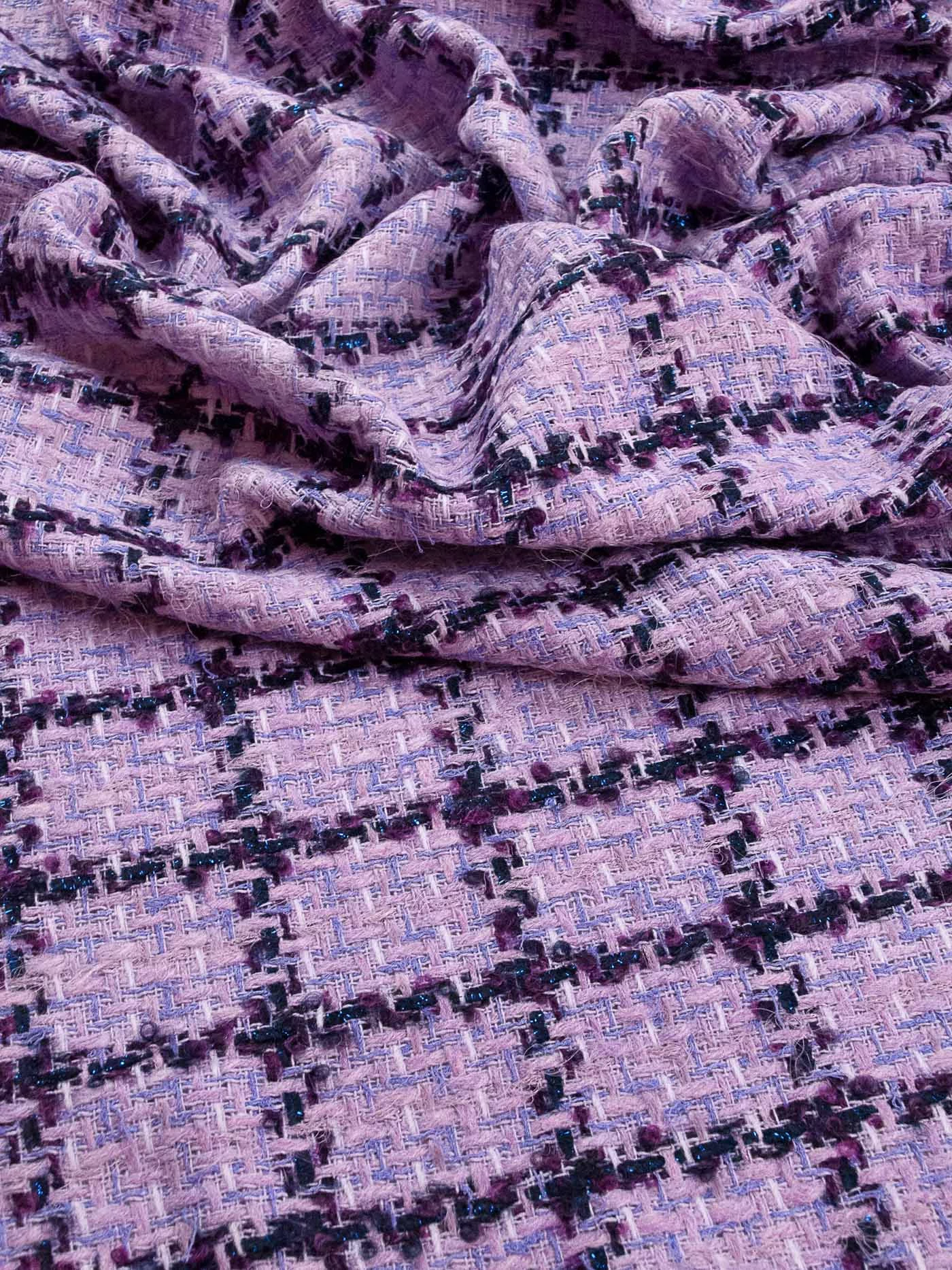 Полотно фирменной фактуры в оригинальном сочетании розового, сиреневого, молочного цвета основы и сине-фиолетовой клетки с деликатно играющими на свету нитями люрекса синего цвета. За счет смесового состава идеально подойдёт на жакеты на подкладе, костюмы, платья и юбки.