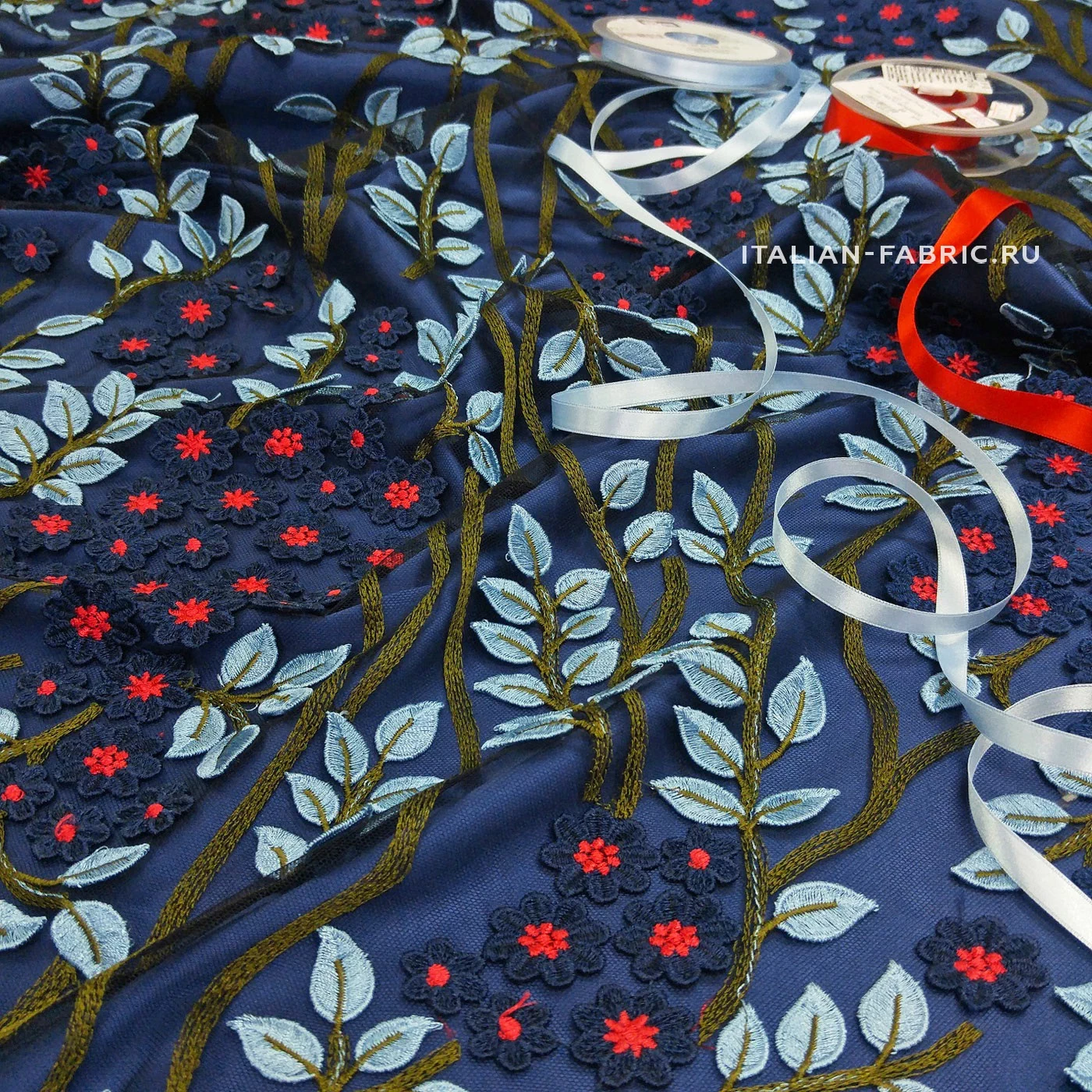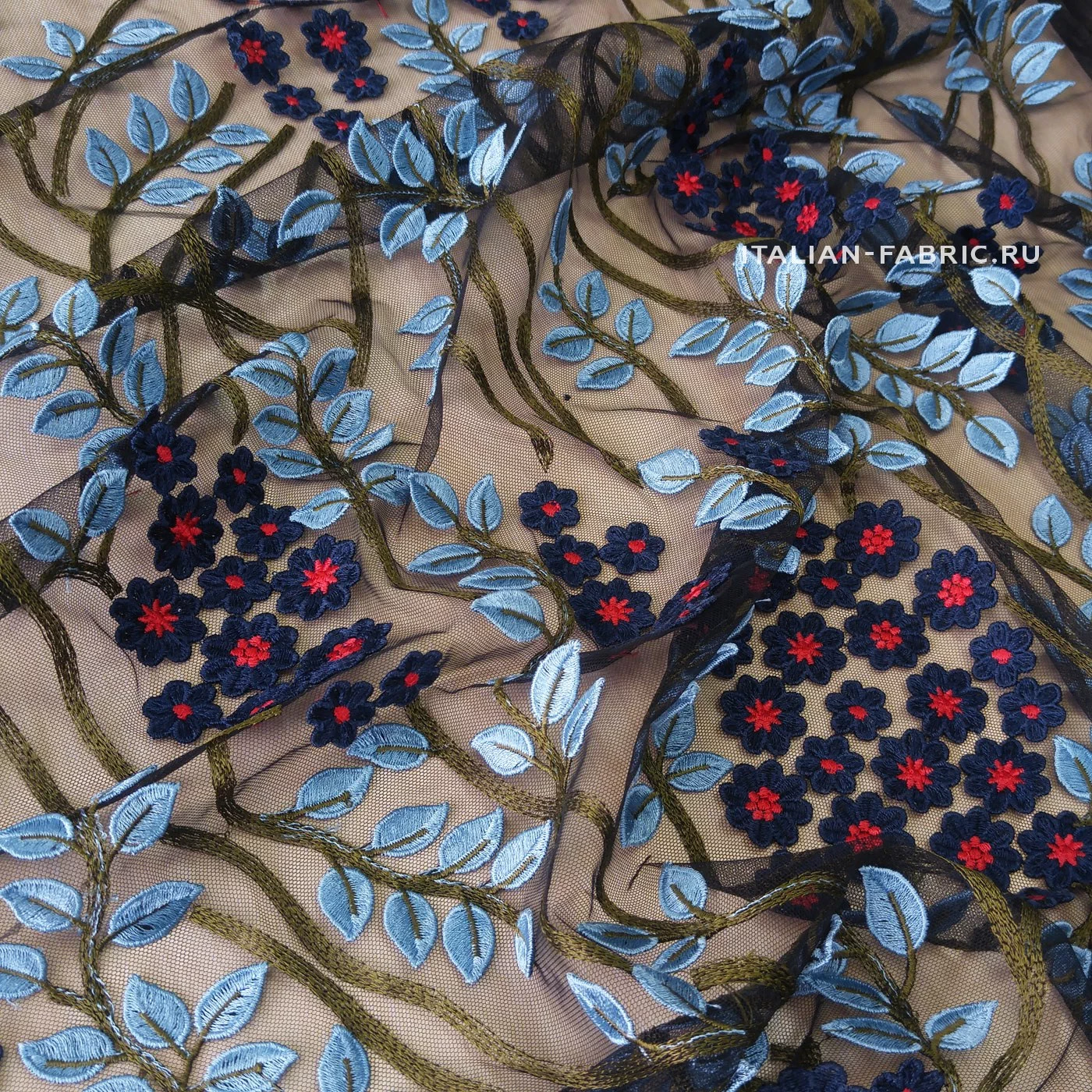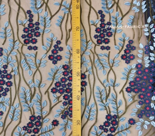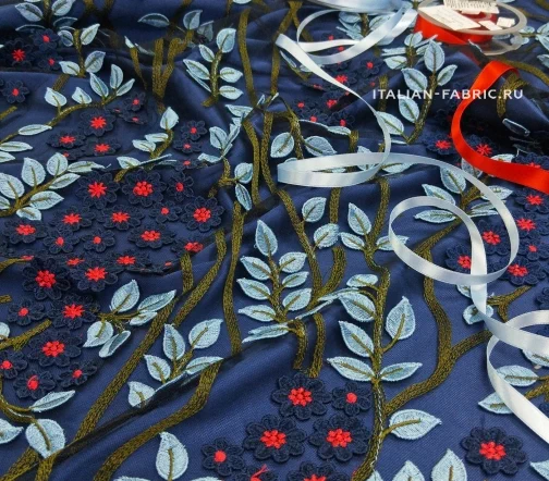 Когда видишь такие материалы, понимаешь, что это настоящее творчество - текстильное искусство! Вышивка на полупрозрачной черной сетке-основе с цветочными паттернами по всему полотну. Вискозные нити играют на свету красивым блеском. Каждая строчка, каждая ниточка настолько филигранно вплетены в ткань, что невозможно не восхититься этим изумительным материалом.
